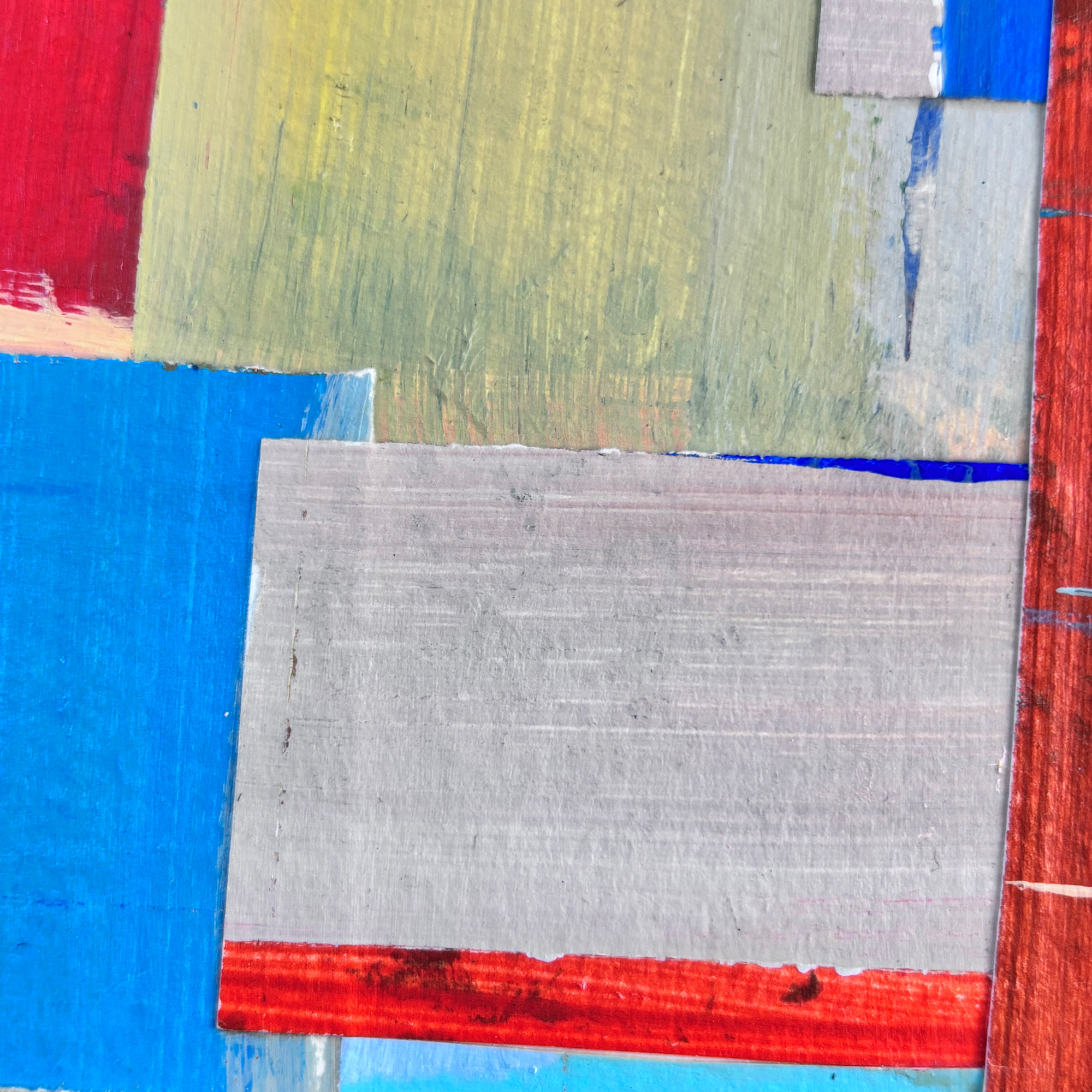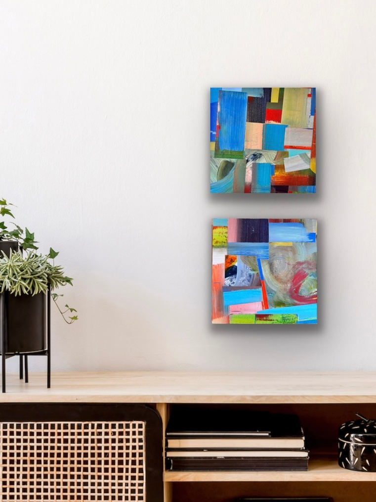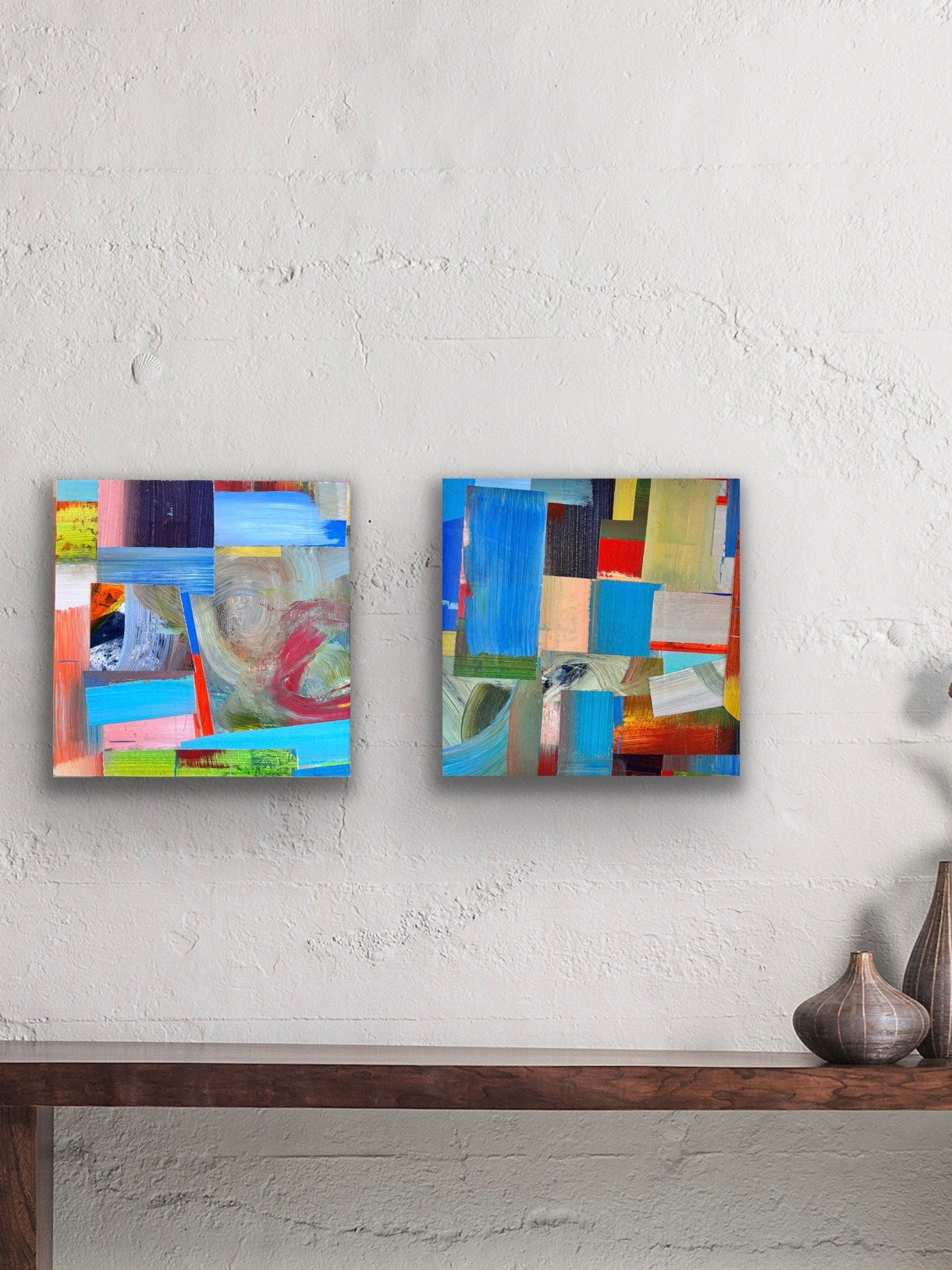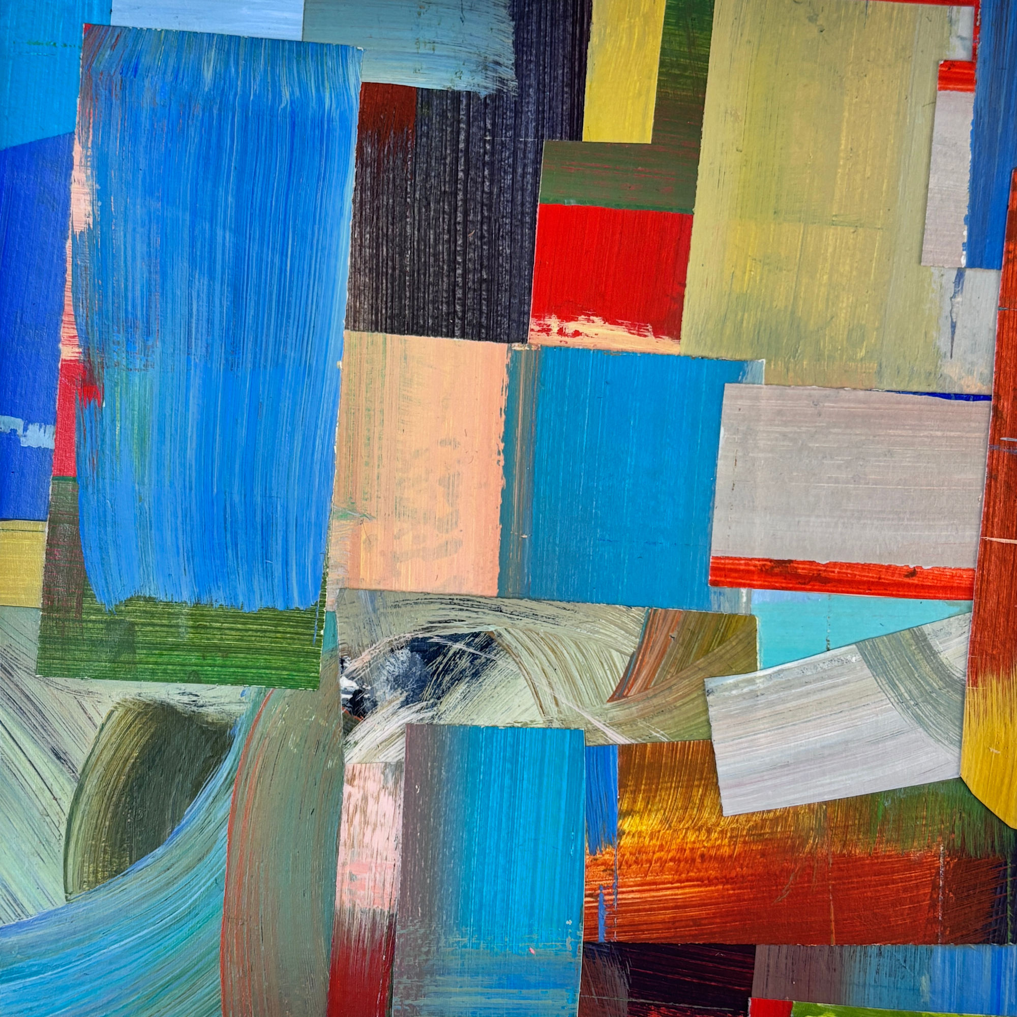 MessageOn the Bias plays with balance, direction, and quiet disruption. I began by painting on paper in two distinct styles, then cut and reassembled the pieces into collage on birch panel. The final composition leans gently to one side — just enough to shift your expectations.