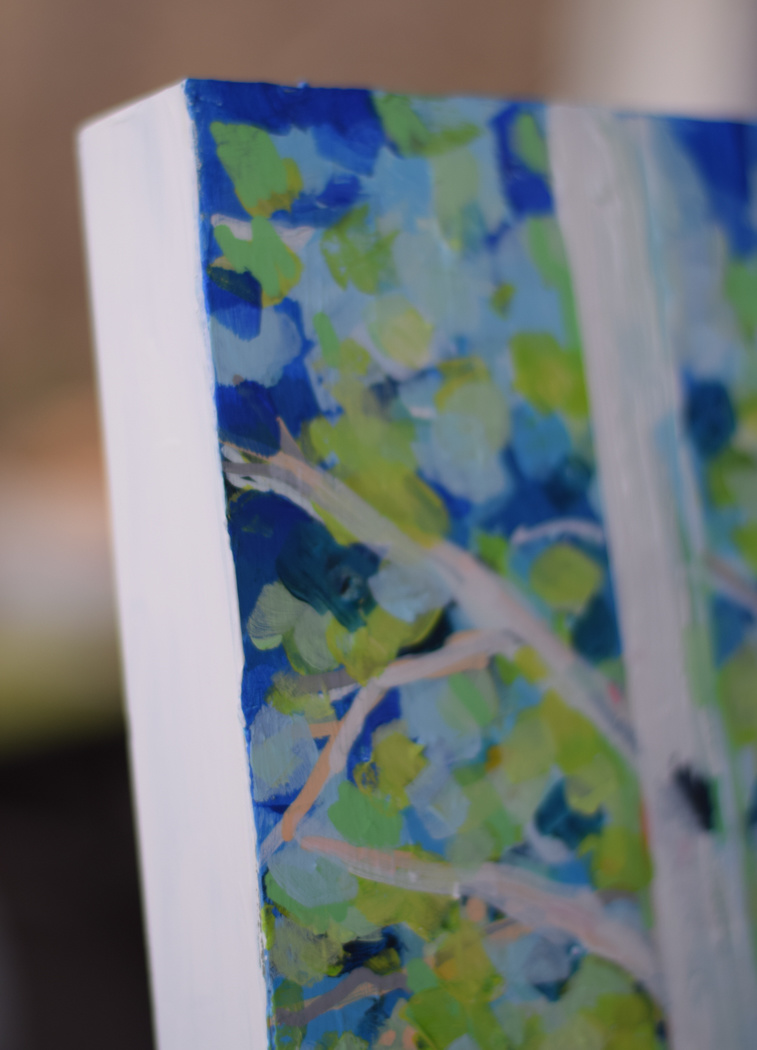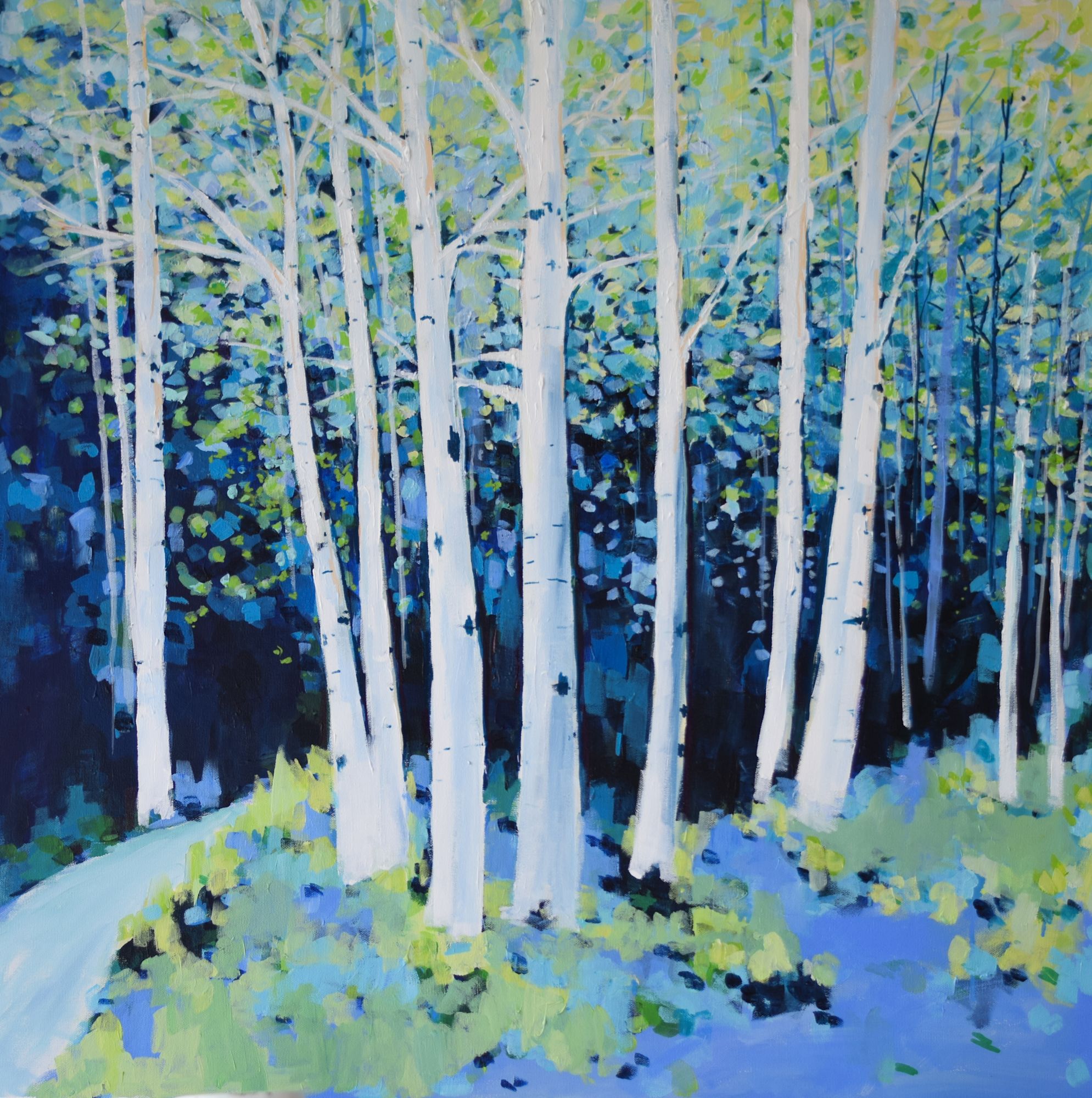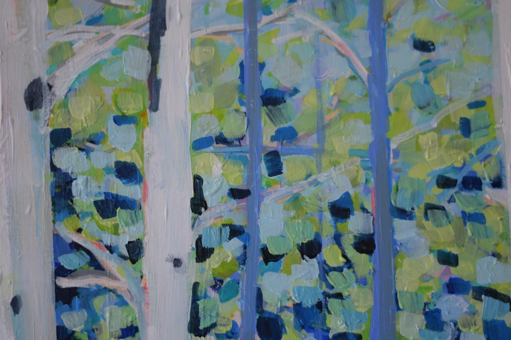 An acrylic painting that transports you to a world of gentle light and vibrant colors. The slender trees and the dreamy atmosphere evoke a sense of peace and wonder."