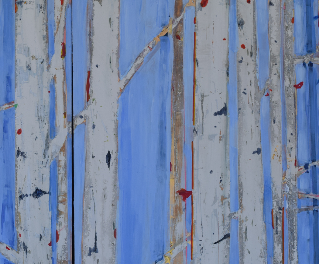 Evoking the rare and beautiful, "Once in a Very Blue Moon Grove" captures a stand of slender, white-barked trees bathed in a cool, blue light. The verticality of the trees creates a sense of reaching towards a pale sky, while the scattered touches of red provide delicate accents within the tranquil scene. This painting invites the viewer into a moment of quiet contemplation, as if witnessing a fleeting, magical occurrence within the woods. This piece is a diptych