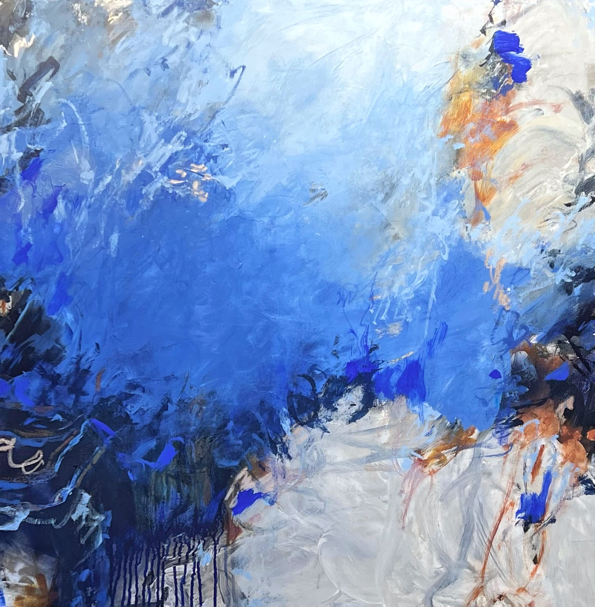 This painting is a study of the warmer side of blue paired with a beautiful copper complimentary color.