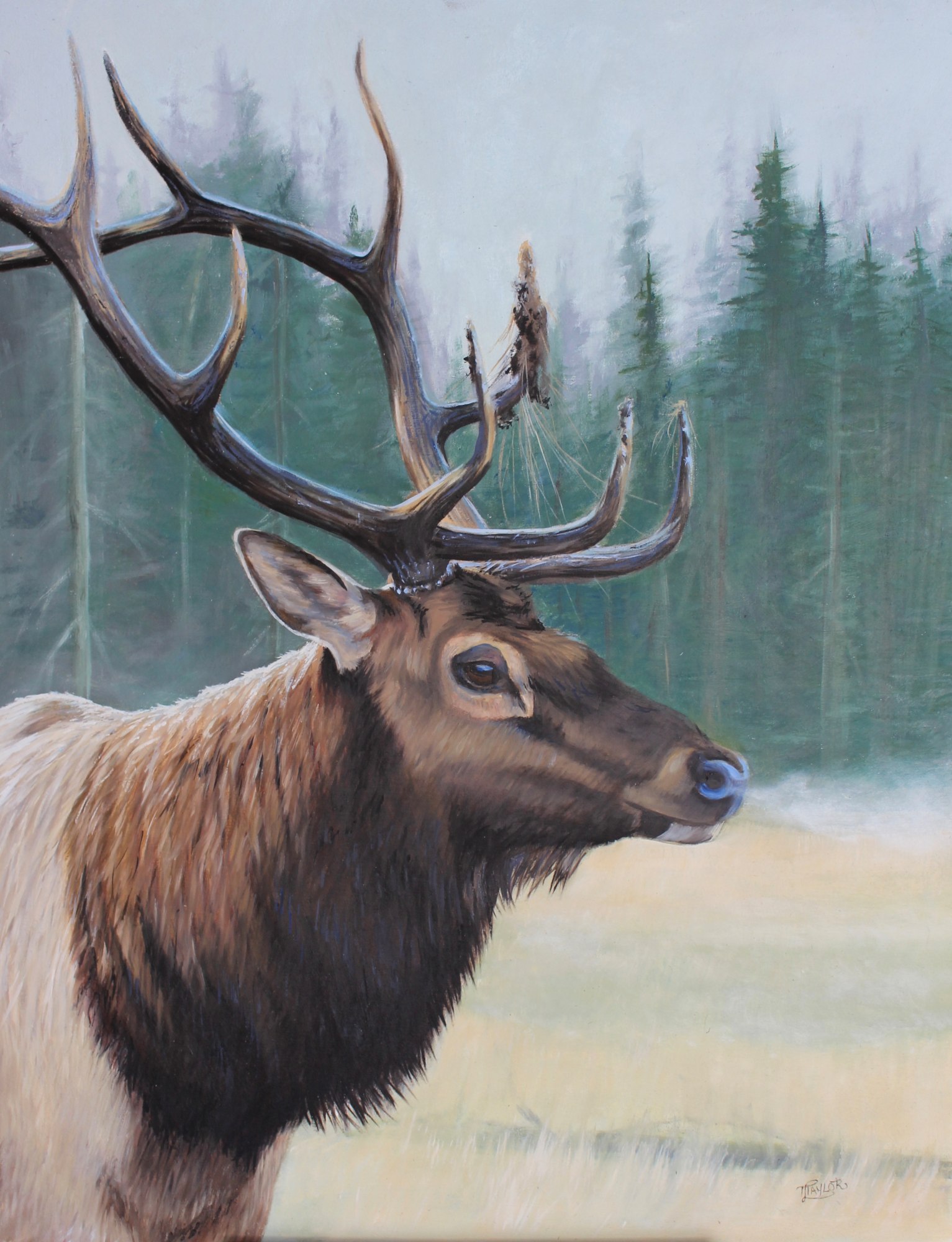 I came upon this bull elk on a frosty morning in Jasper park. He had been digging in the dirt with his horns and the evidence was still hanging from them. I loved the breath that would escape in streams of steam from his nostrils and wanted to capture the crispness of the air and the quietness of the morning.
