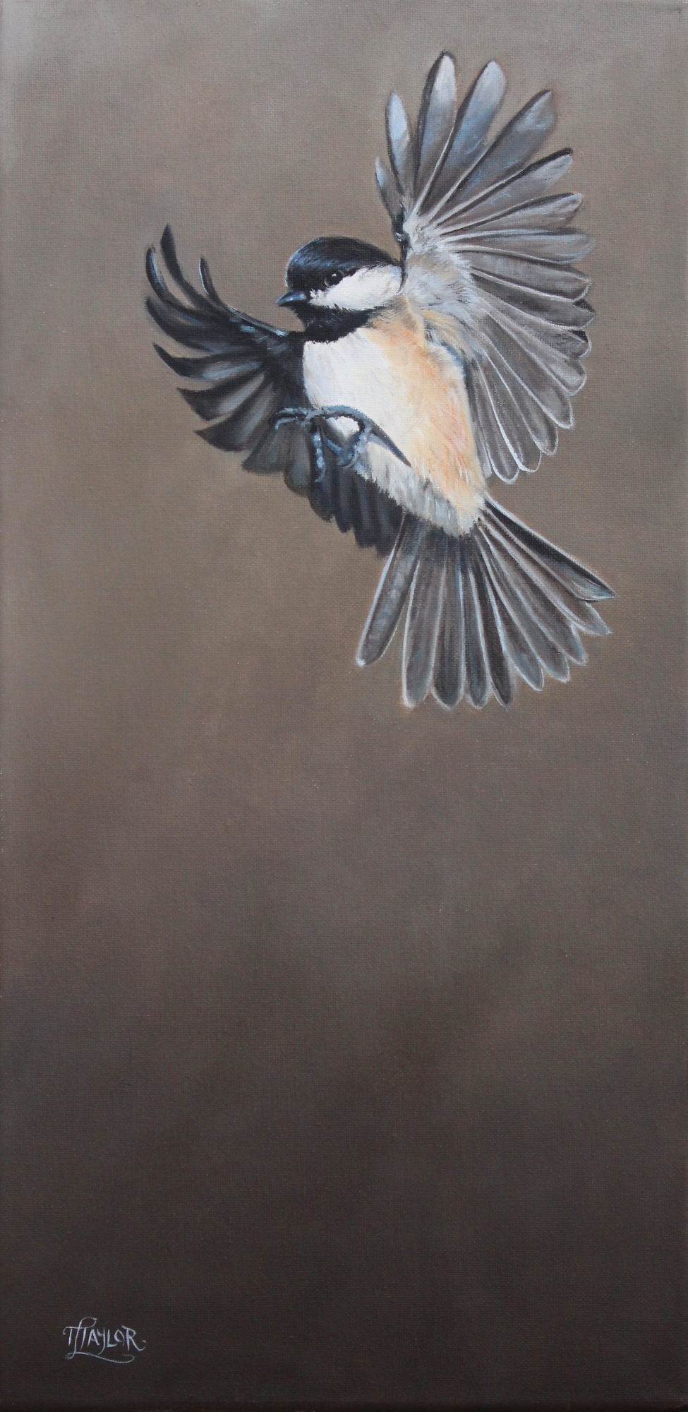 I love chickadees as they are one of the few small birds that will stick around all winter in Alberta. I wanted to keep the background muted with unusual boundaries created by the untraditional size and orientation of the piece, to make the image of the bird more powerful and accentuate the flight of the bird to provoke the feeling of freedom.