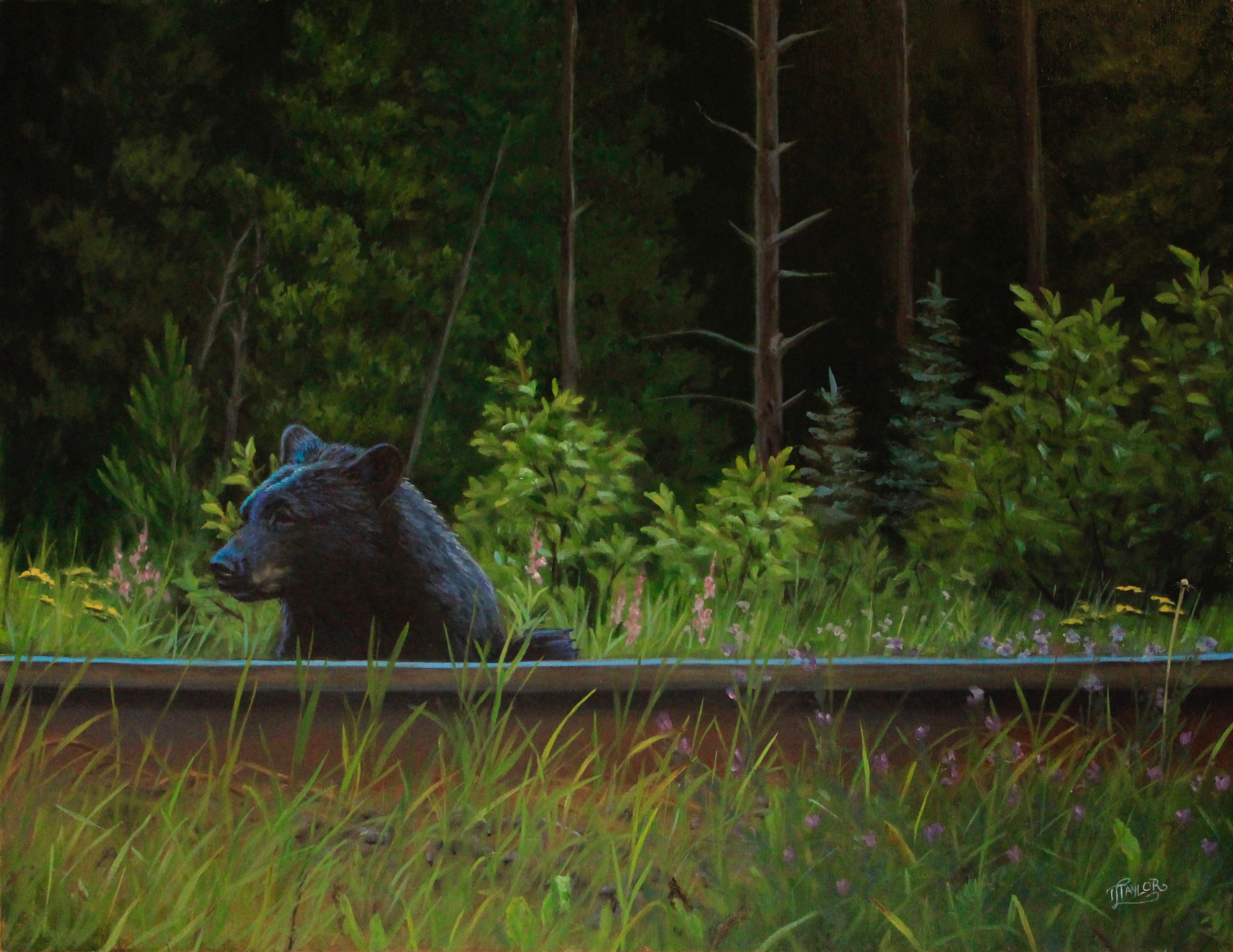 While making our annual trip through the Rockies to the coast, my husband and I came across this guy resting on the train tracks. Although I named it "I Hear The Train A Comin'", playfully thinking of a line from a Johnny Cash song, the matter of bears on tracks is very serious. Many bears die on train tracks, apparently unaware that the train is coming. They hang out on the tracks to eat grain that falls from the cars, berries along the tracks, and because like all roadways they are easy to travel.