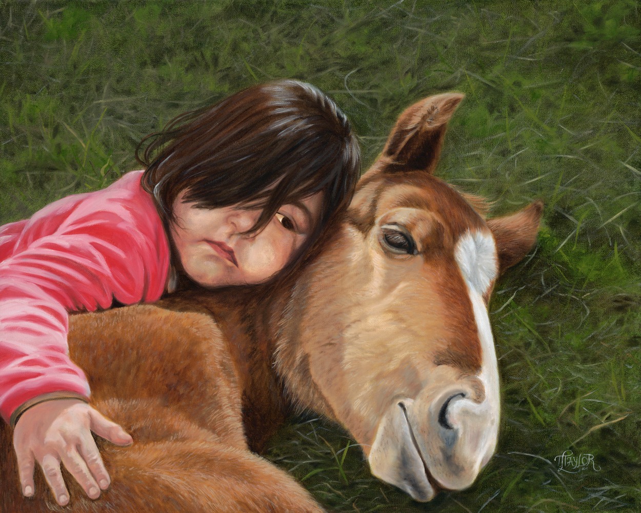 I am always moved by the love and innocence of children. I wanted to capture that tender love in this piece as the little girls lies with the colt.