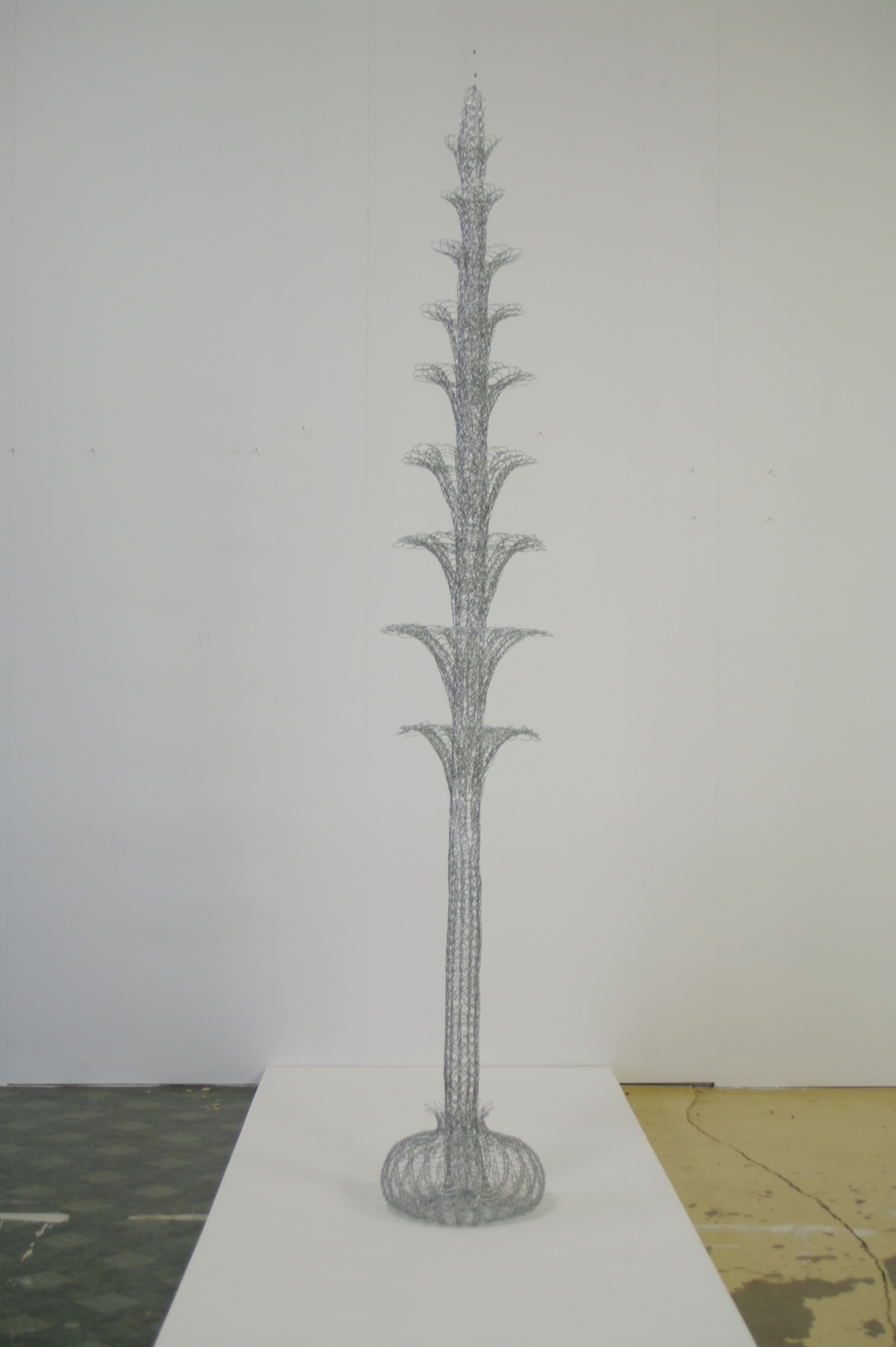 The wire conveys the toughness and growth habits of these feral plants, its steely resilience establishing its stranglehold in the environment, twisting, tangling and weaving its way to further expand the patch. Underground tubers and corms link together to becoming large open structures, endlessly multiplying. Nets of knitted wire drape over and veil native plants. Plants that are no longer there, long deceased.