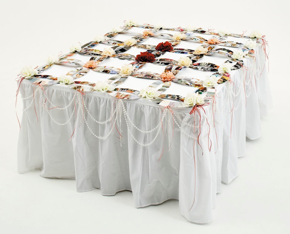• magazine pictures, laminate, beads, ribbon, artificial flowers