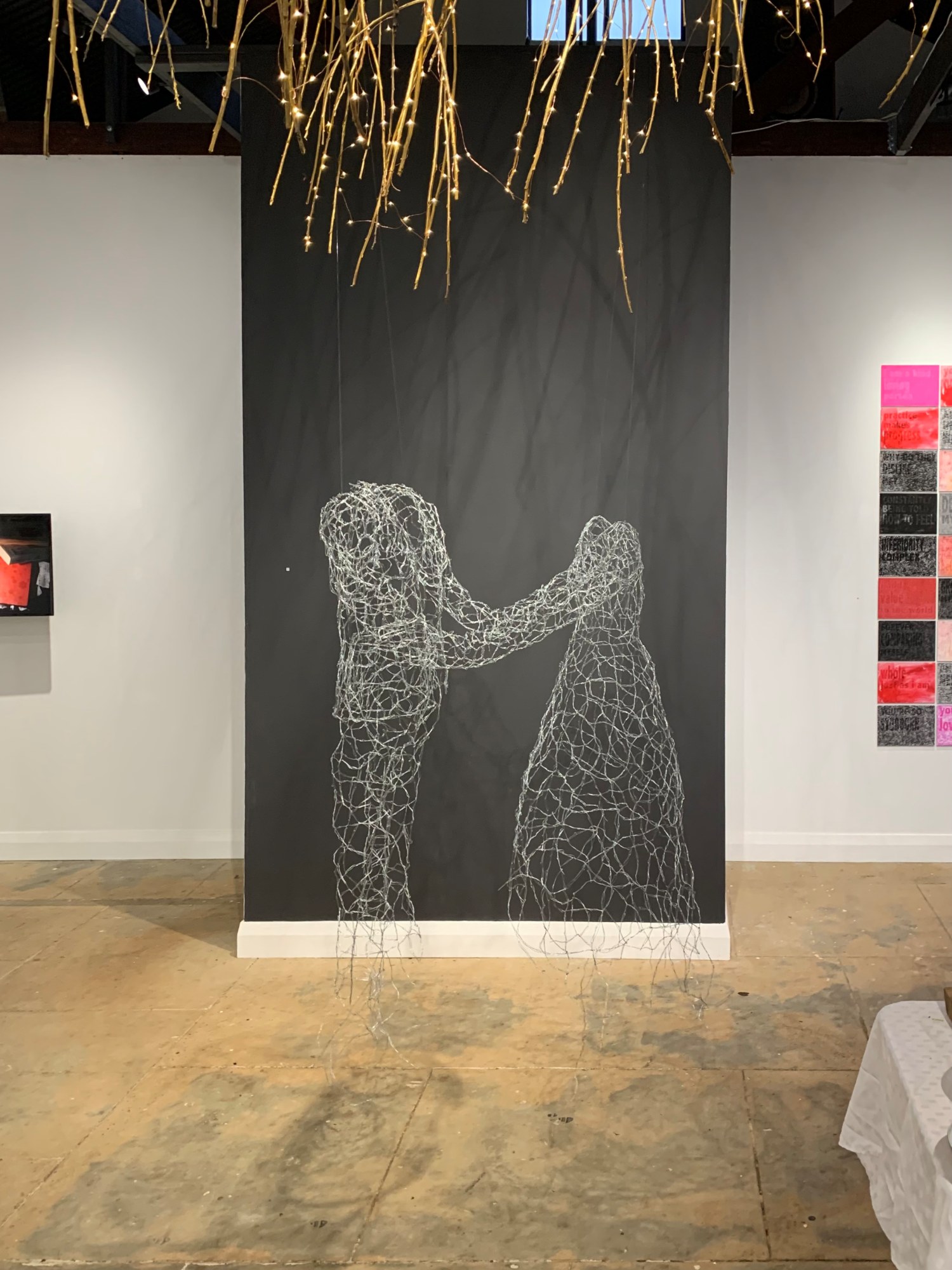 I have finger knitted, shaped and molded this wedding gown and suit with my bare hands. Carefully hand bent every stitch and woven it randomly to hold the garments together. Small holes. Big gaps. Held together by threads. Overlapping tangled threads. Strong threads. Threads of wire. Tough, but flexible. Like a longstanding marriage really.