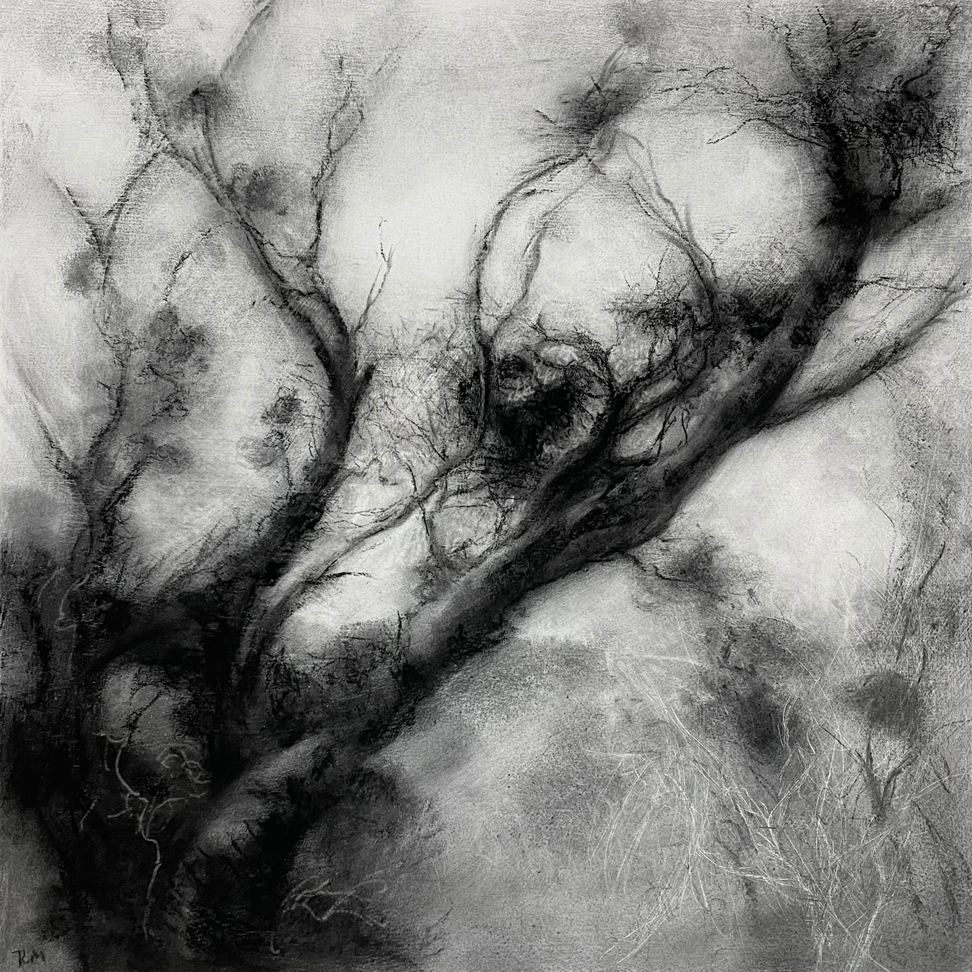 One of a series of charcoal and conté drawings inspired by a large old birch tree in Calder Wood, West Lothian. Its branches are filled with 'Witch's Brooms', unruly growths prompted by fungal, bacterial or viral infections. Set against the pale sky, these dense clusters of tiny branches decorate the birch's winter architecture.