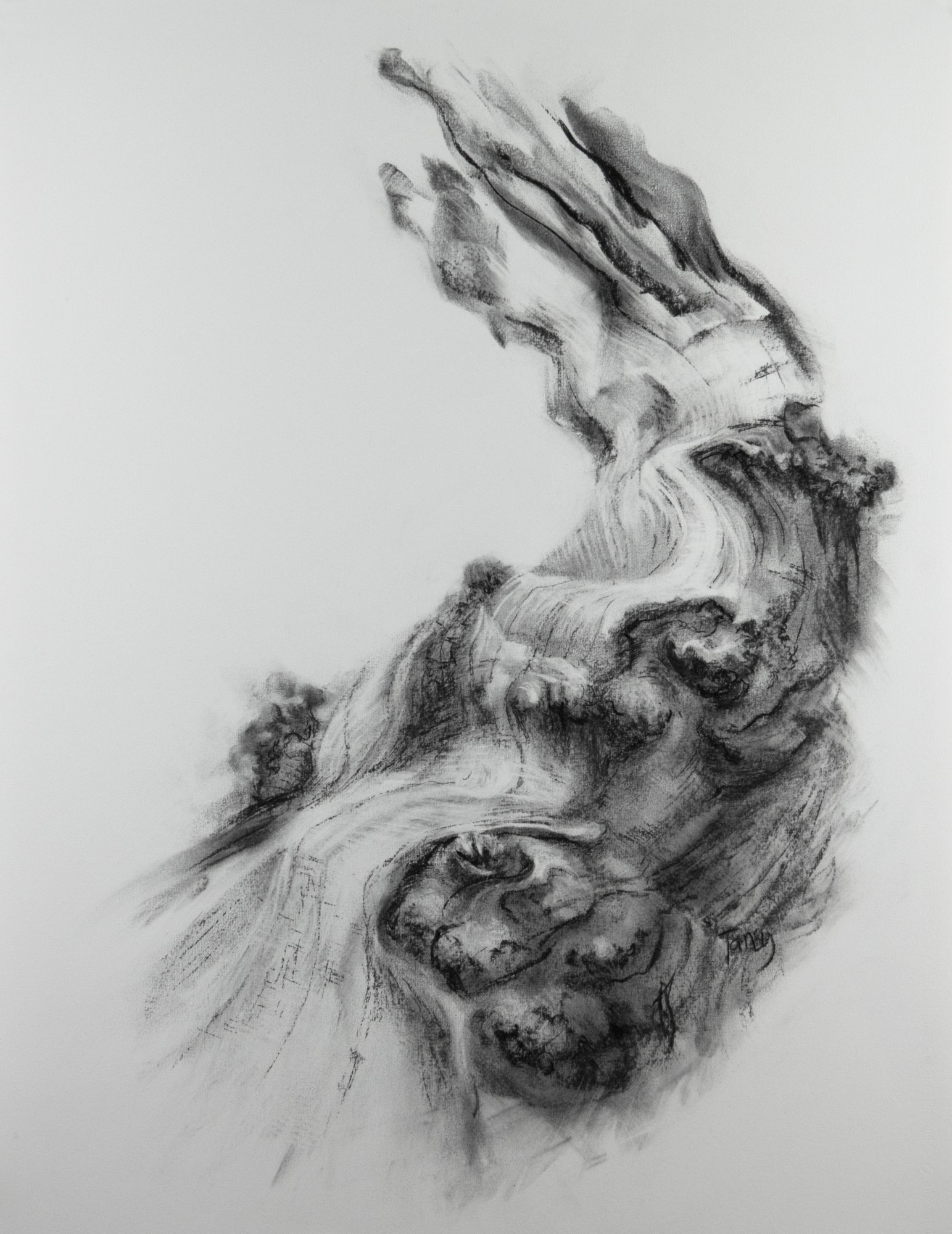 Charcoal drawing inspired by the growth and decay of ancient oak trees. Suggesting wood, smoke and water, the flowing forms hover somewhere between abstraction and figuration.