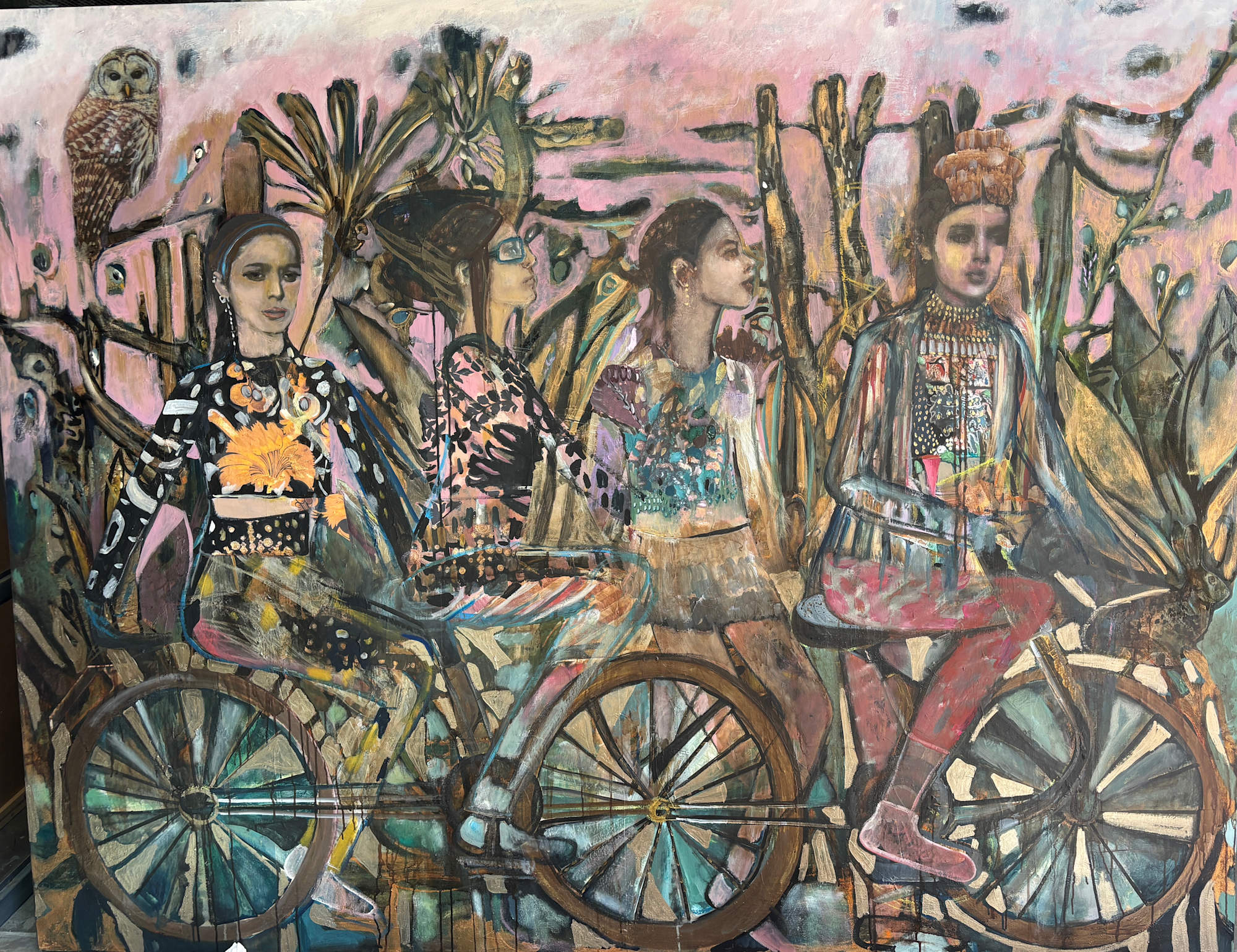 This painting is inspired by the sacred bond of women as protectors, guides, and carriers of ancestral wisdom. The four female figures ride together on a single bicycle, symbolizing unity, shared purpose, and the collective journey through time and memory. Each woman represents a different facet of guardianship—intuition, strength, beauty, and vision—embodying a deep connection to nature, spirit, and heritage.