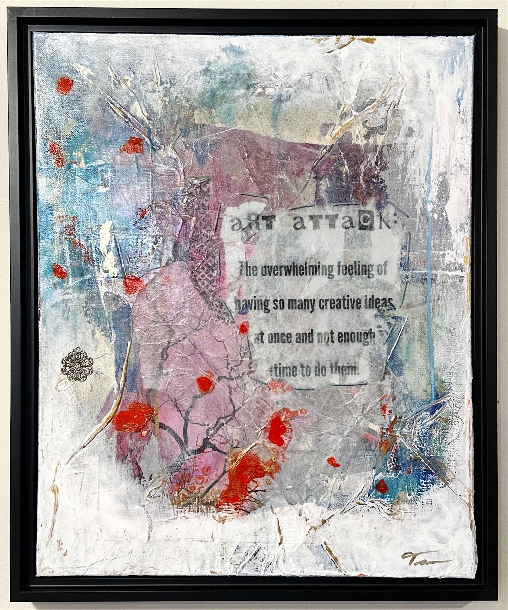 Humorous abstract collage on canvas, with black floater frame.