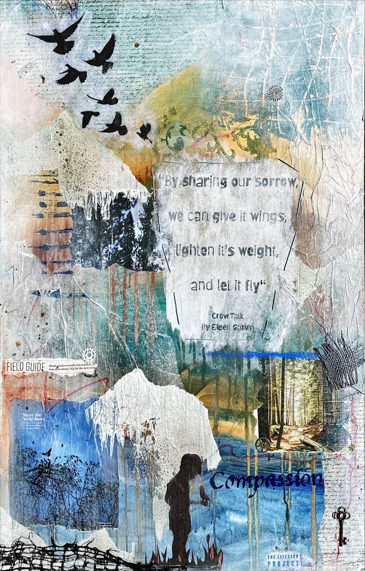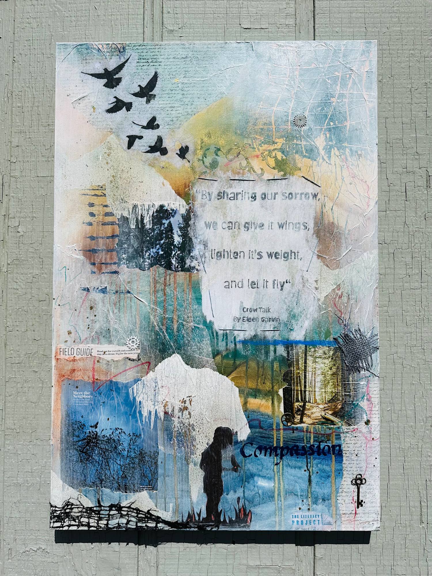 Inspired by the book Crow Talk, by Eileen Garvin. This piece was created for The Literacy Project of Eagle County’s 2025 Fundraiser Event. It will be actioned off, with proceeds donated to the foundation.