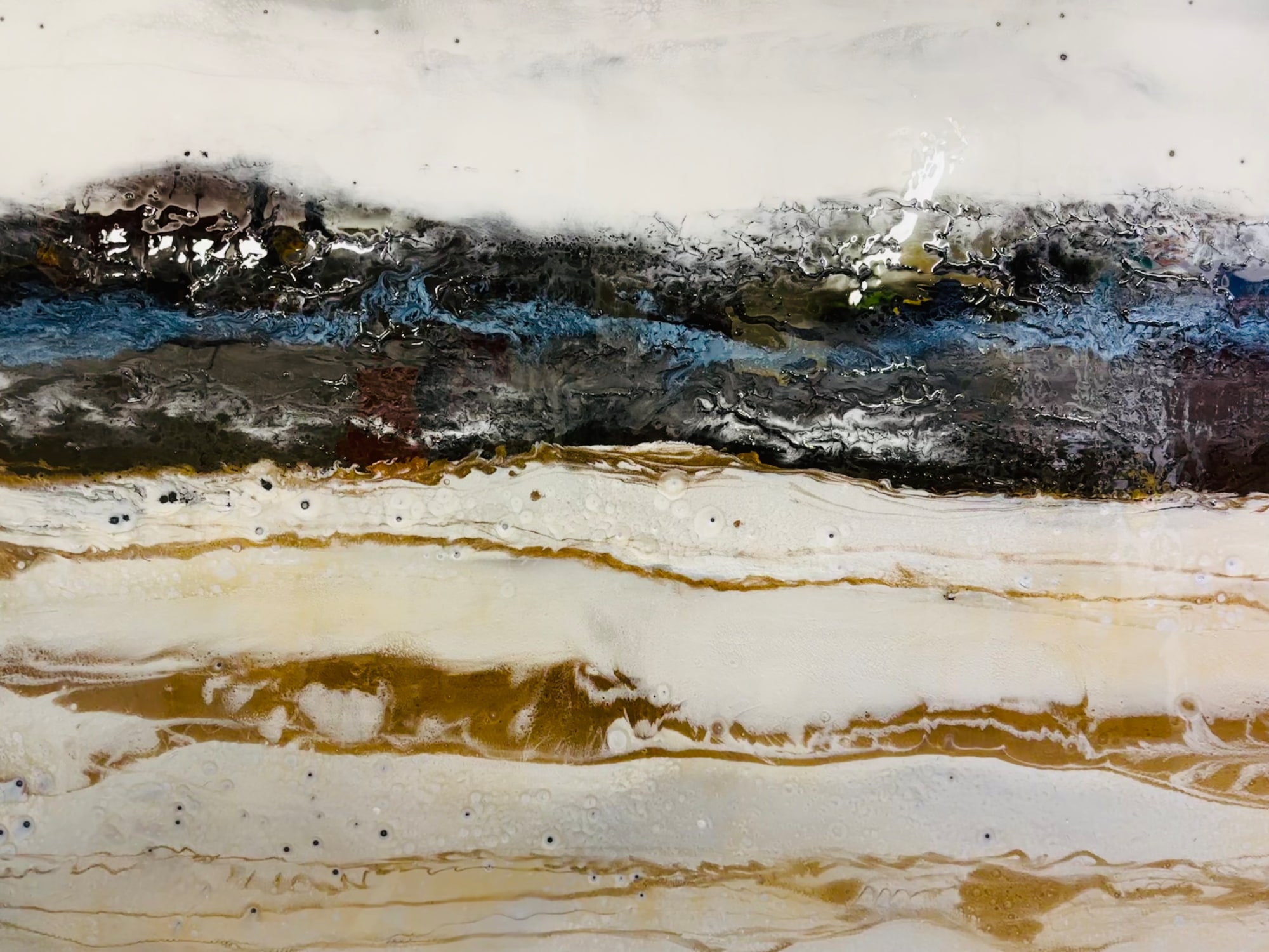 Inspired by images of earth from satellite, this large mica infused resin abstract artwork depicts landscape designs created by mining tailings. In my series "Earthbound", I have been exploring naturally occurring and man-made geological features all over the planet. It is fascinating to me to see the beauty in the patterns, colors, and dynamics of the zones I have focused in on. Some, like this zone, are the remains from mining processes. I find it interesting to explore the visual elements of the space and also to research what happened here. In instances influenced by human activity, I'd like to bring awareness to the impacts of toxic practices, in hopes of inspiring ways to manage these processes more thoughtfully going forward. We only have one Mother Earth.