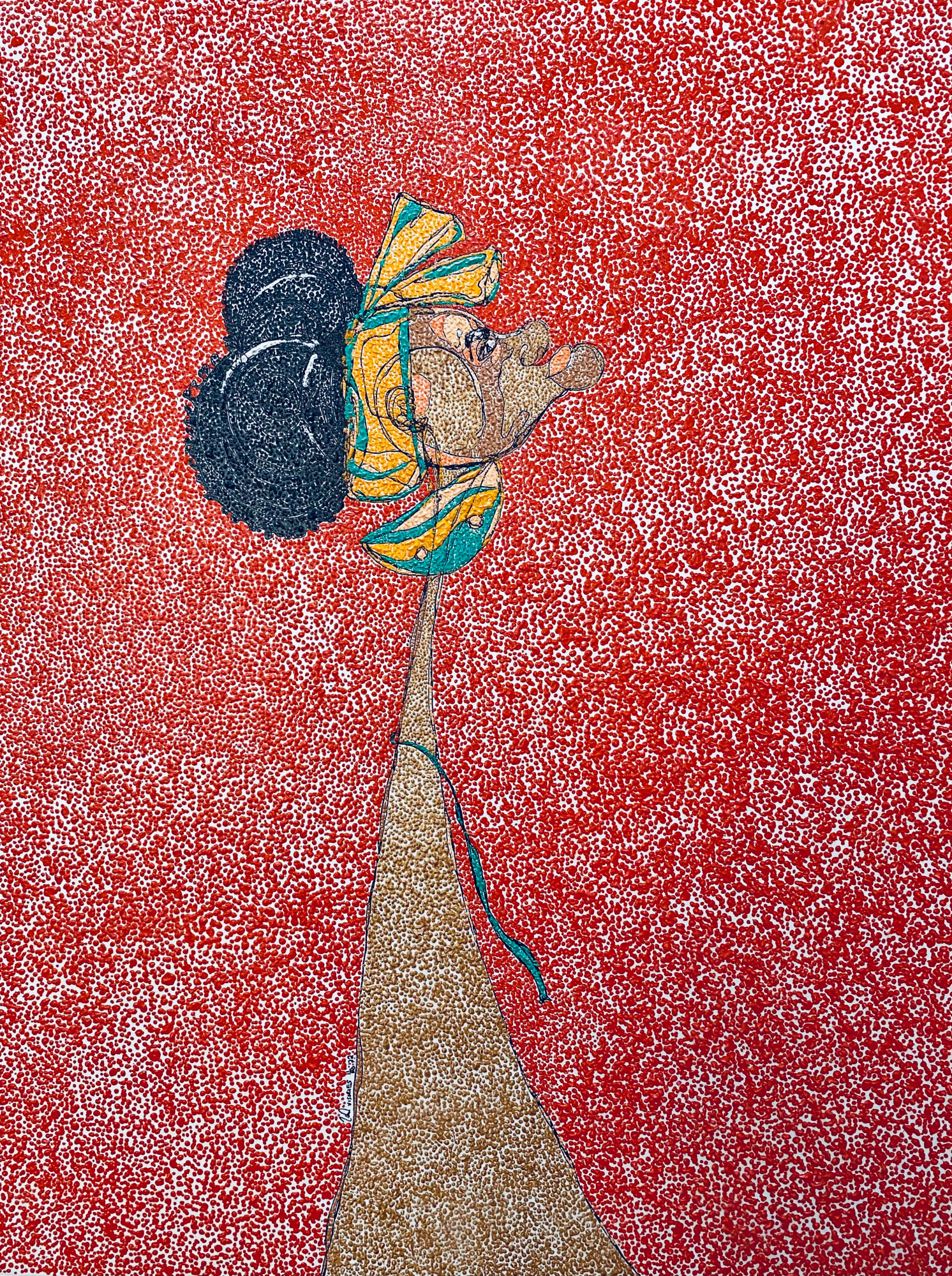 Set against a rich red background symbolizing resilience, this painting pays homage to the Black Power and Civil Rights movements of the 1960s and 1970s and their profound impact on the youth. During this era, young people passionately advocated for positive changes in education, values, legal enforcement, and entertainment.