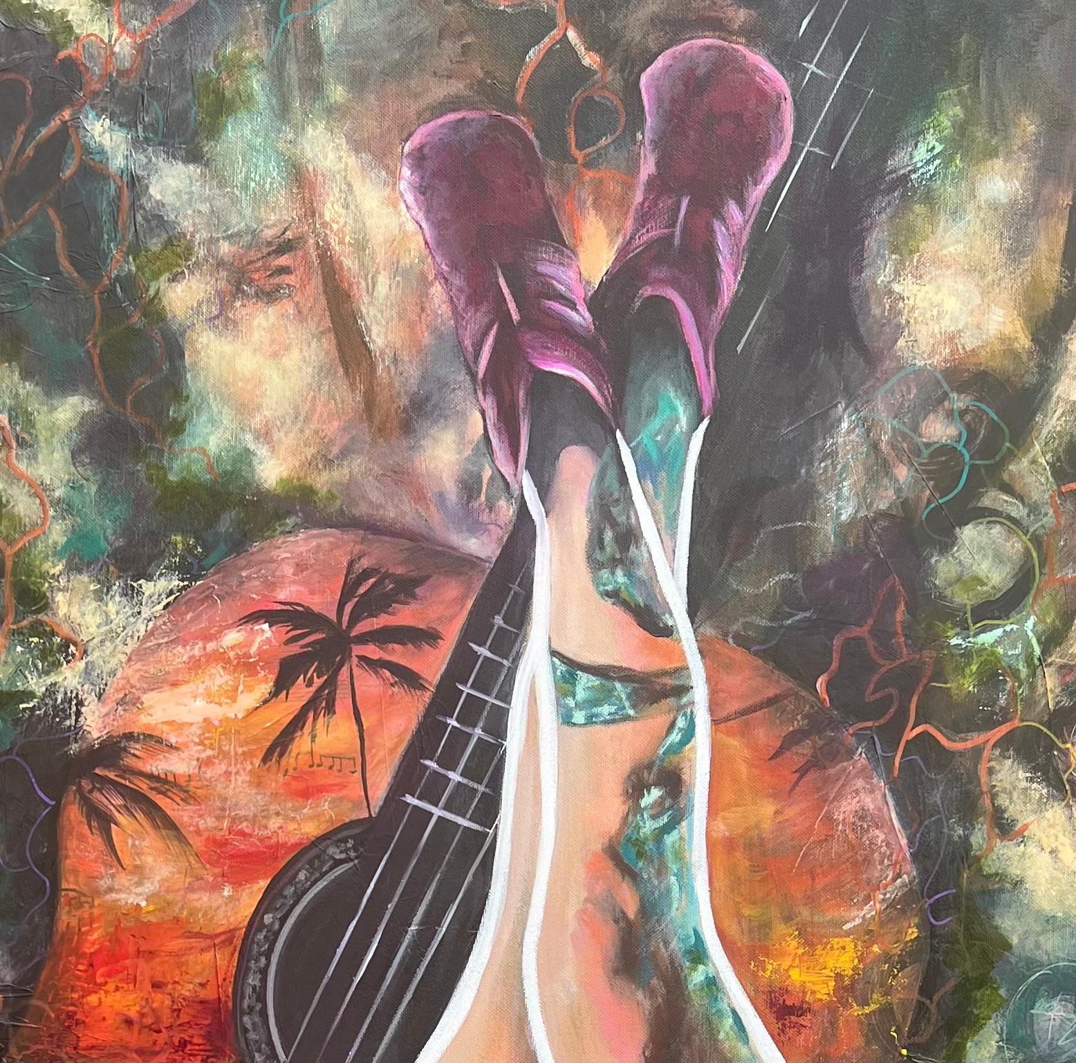 TThis painting celebrates the beauty of life's multifaceted nature. The abstract background symbolises the complexity of experience, while the sunset represents the dreams and aspirations that guide us. The woman, relaxed and at ease, dreams of what lies ahead, but faces and deals with the roller coaster of daily life. The interplay of chaos and calm contribute to the rich tapestry of our lives.