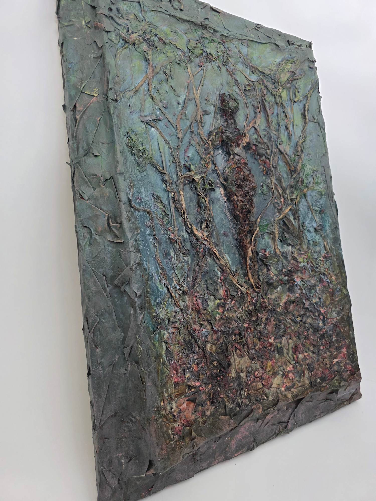 The body is not separate from the earth. It is soil, water, and stone—shaped by the same forces that raise mountains and unfurl petals. In this work, roots climb and weave through a human silhouette, tracing the memory of that shared origin. Flesh of the Earth, Bloom of the Soul is a hymn to that memory: flesh as fertile ground, soul as a blossom rising. Its textured surface evokes strata of soil and seasons of decay and renewal, reminding us that our becoming is inseparable from the earth’s own cycles of loss and growth. This piece invites viewers to stand before it as one living body among many—to sense the reciprocity of breath between human and landscape, to feel that we are kin, continually shaping and sustaining one another.