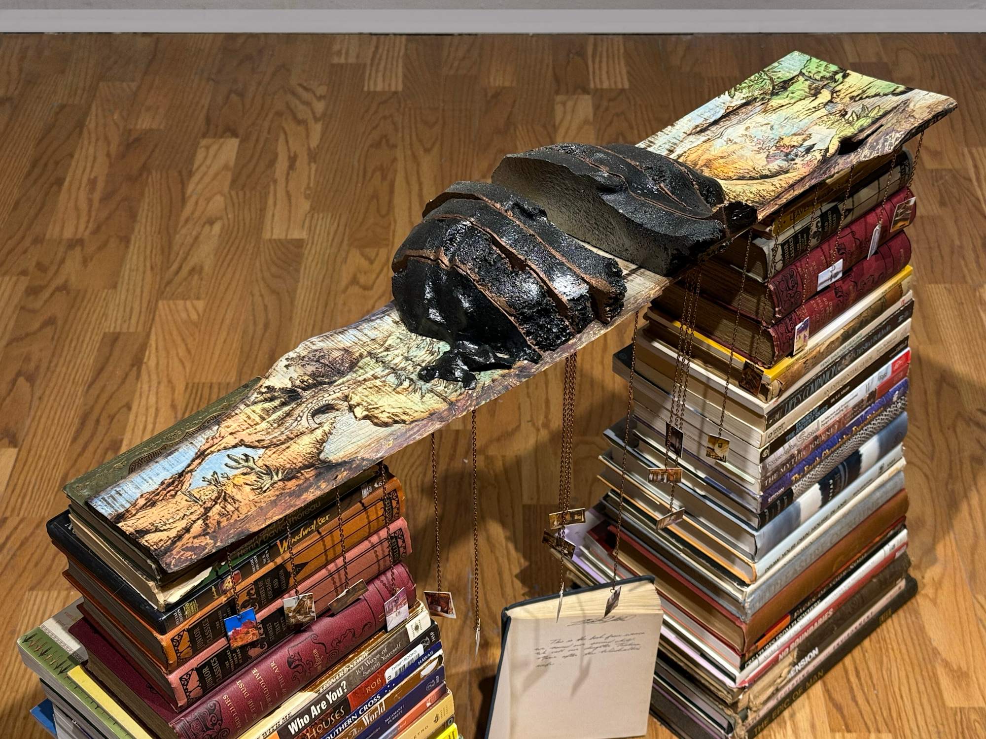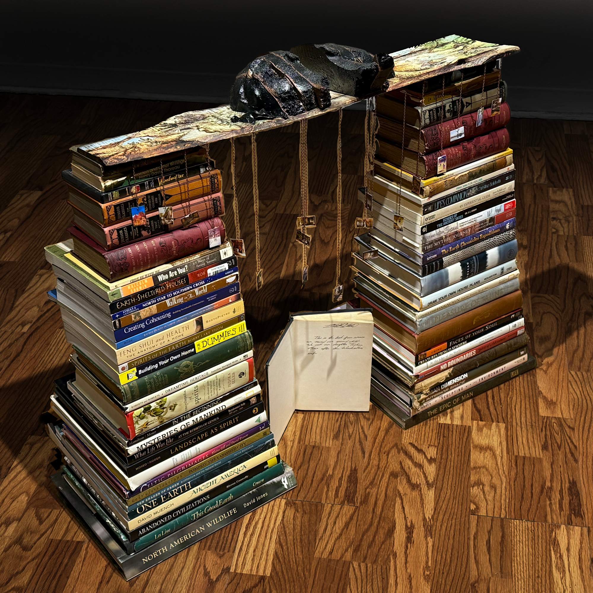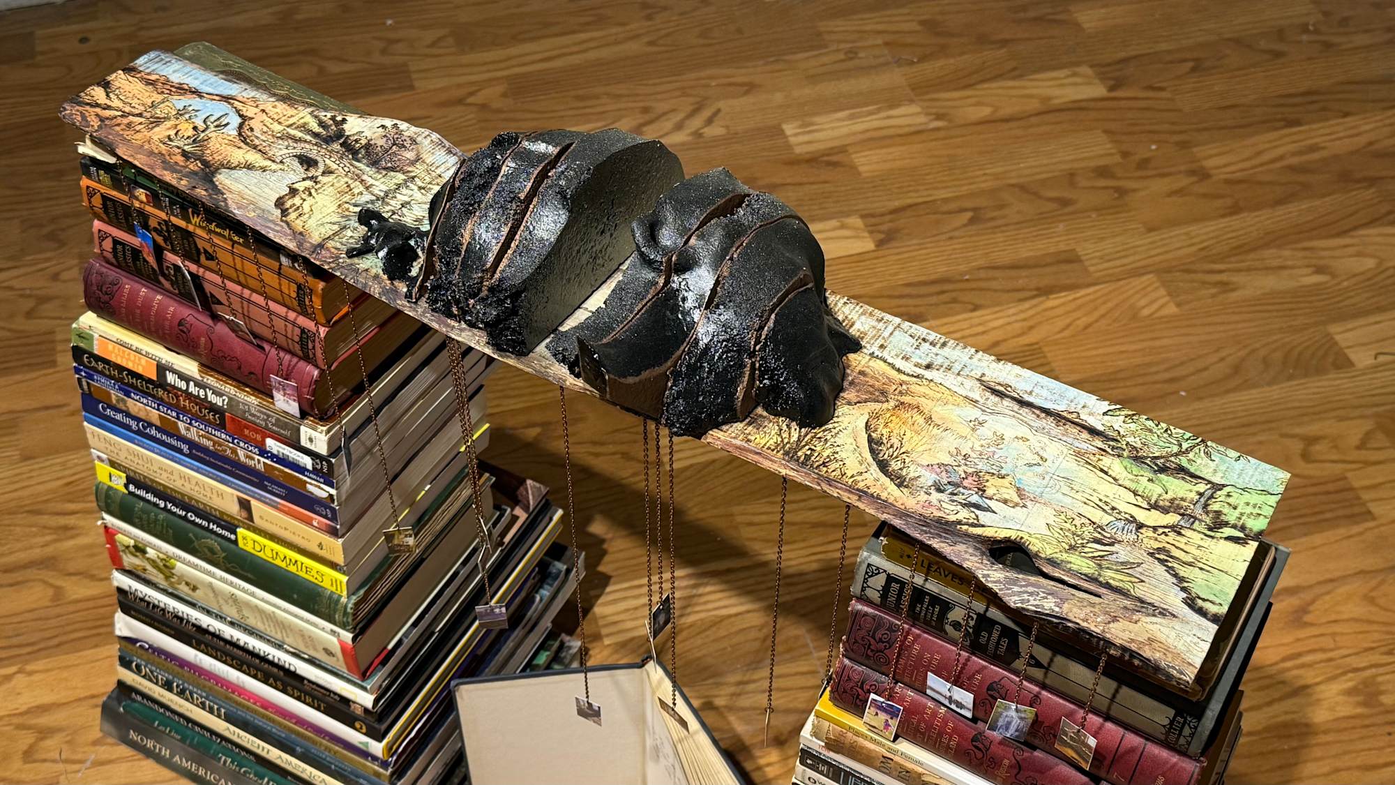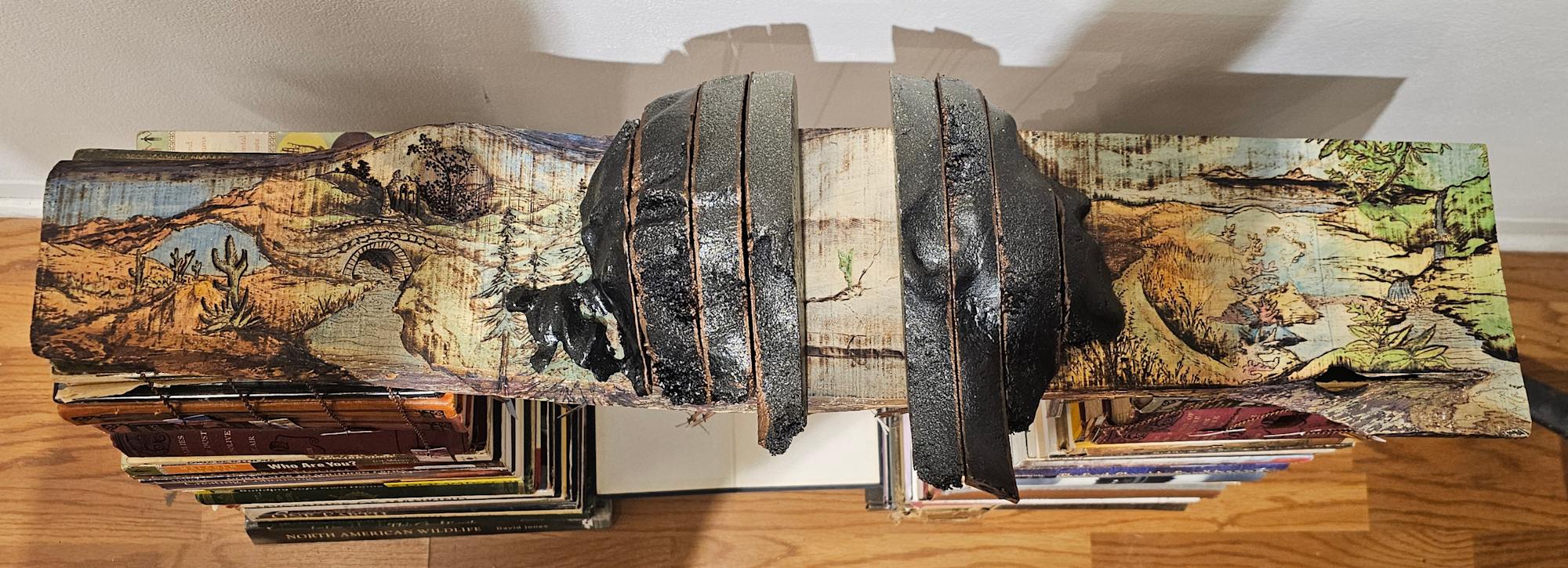 This evocative sculpture is a testament to a life spent in constant motion, shaped by the ever-changing landscapes of travel, loss, and self-discovery. The foundation is built from books, each one resonating with themes of home, journey, and identity. Suspended above them, a weathered wooden bridge burns with the imprint of shifting terrains, a visual representation of the artist’s nomadic experience. At its center, two fractured halves of a head divide the scene, symbolizing both fragmentation and resilience. In the spotlight of this broken passage, a single sprout emerges from a crack in the sidewalk—a moment frozen in time, representing the artist’s experience of homelessness. It recalls a day of despair when a ray of light illuminated a simple weed, offering an unexpected spark of hope and the will to move forward. Dangling from delicate chains, faded photographs capture glimpses of past travels and abandoned homes, echoes of fleeting shelters and lost places. At the heart of the composition, an open book—The Windwalker—bears an inscription from the artist’s mother, revealing the origin of her name. This treasured book, the only possession carried through homelessness and uncertainty, serves as an anchor to belonging, a connection between past and present, rootlessness and home. Through this deeply personal assemblage, the artist weaves a story of survival, transformation, and the enduring power of words to guide us through the winds of life.