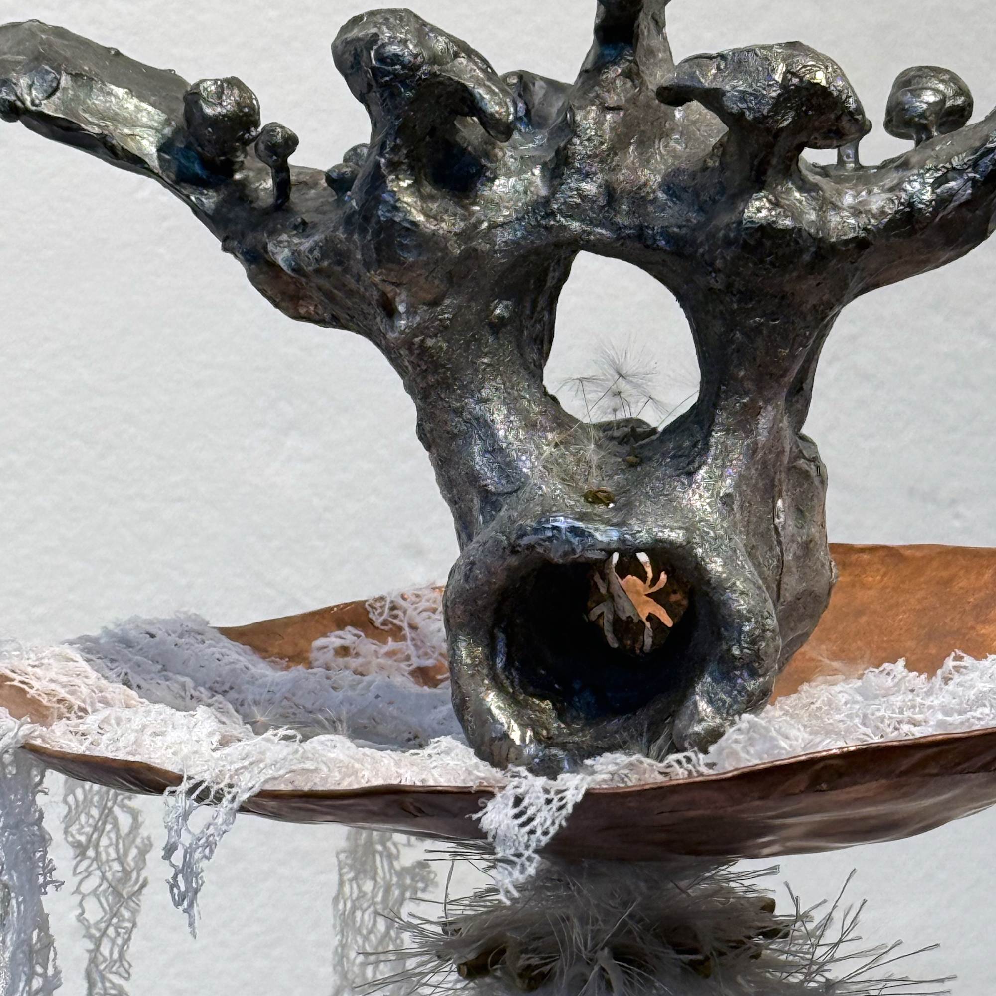 Spilling from the bowl, delicate tendrils of mycelium spread outward—an intricate network mirroring the nervous system, the unseen web that connects all living things, whispering signals across the earth. Dandelion seeds dust the entire composition, carrying the ephemeral nature of existence. They remind us that life, like the fleeting wish of a child blowing seeds into the wind, is precious while it blooms—not only in its final moments. This sculpture invites reflection on the beauty of impermanence and the interconnectedness of all things.