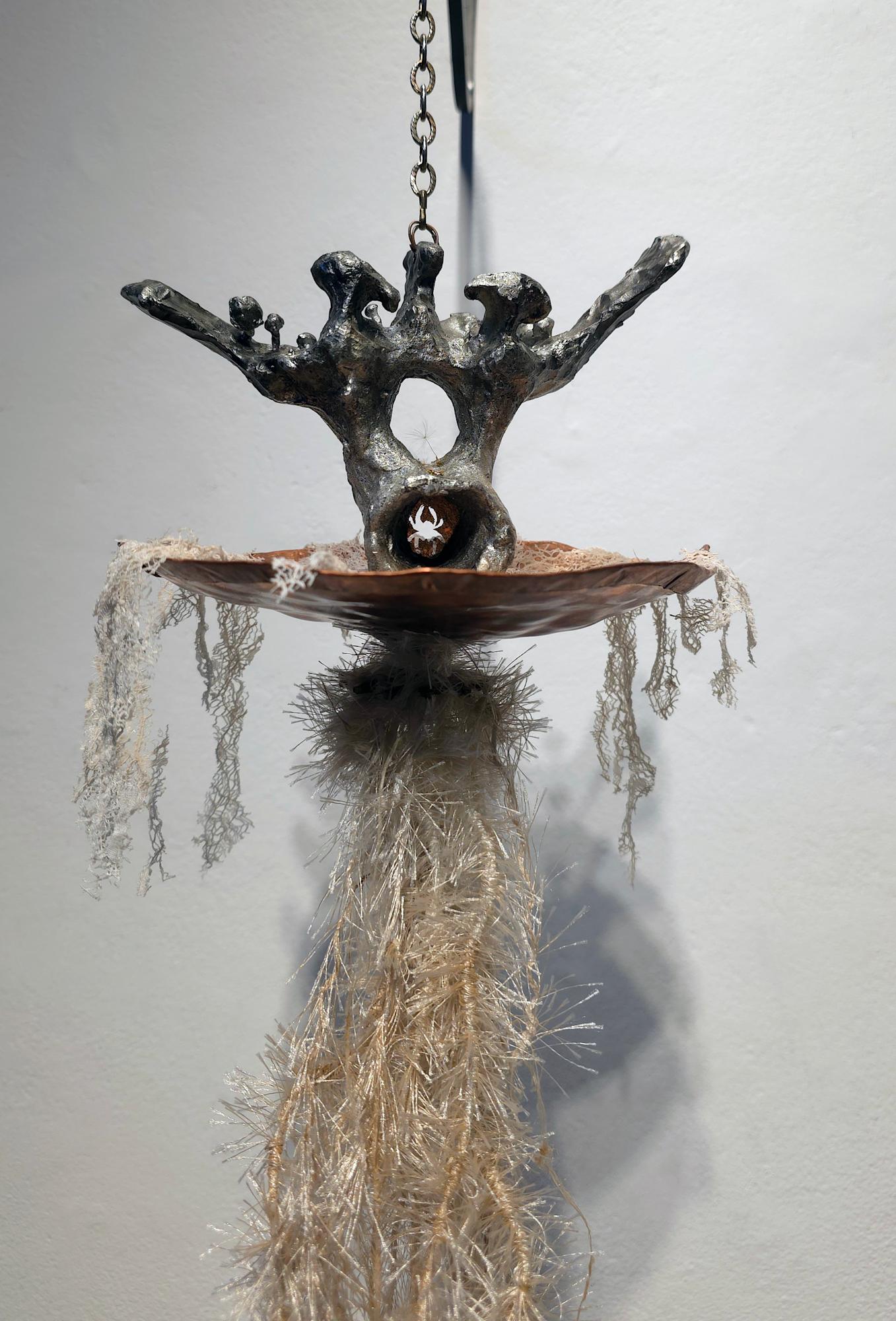 Within the hollow center of the vertebrae, a spider is cut out, embodying the weaver of fate—spinning the narratives of life and guiding souls toward the unknown. Beneath this, a shallow, hammered copper bowl cradles the fragile wings of a death moth, a creature drawn to the light, embodying both transformation and the inevitability of passing.