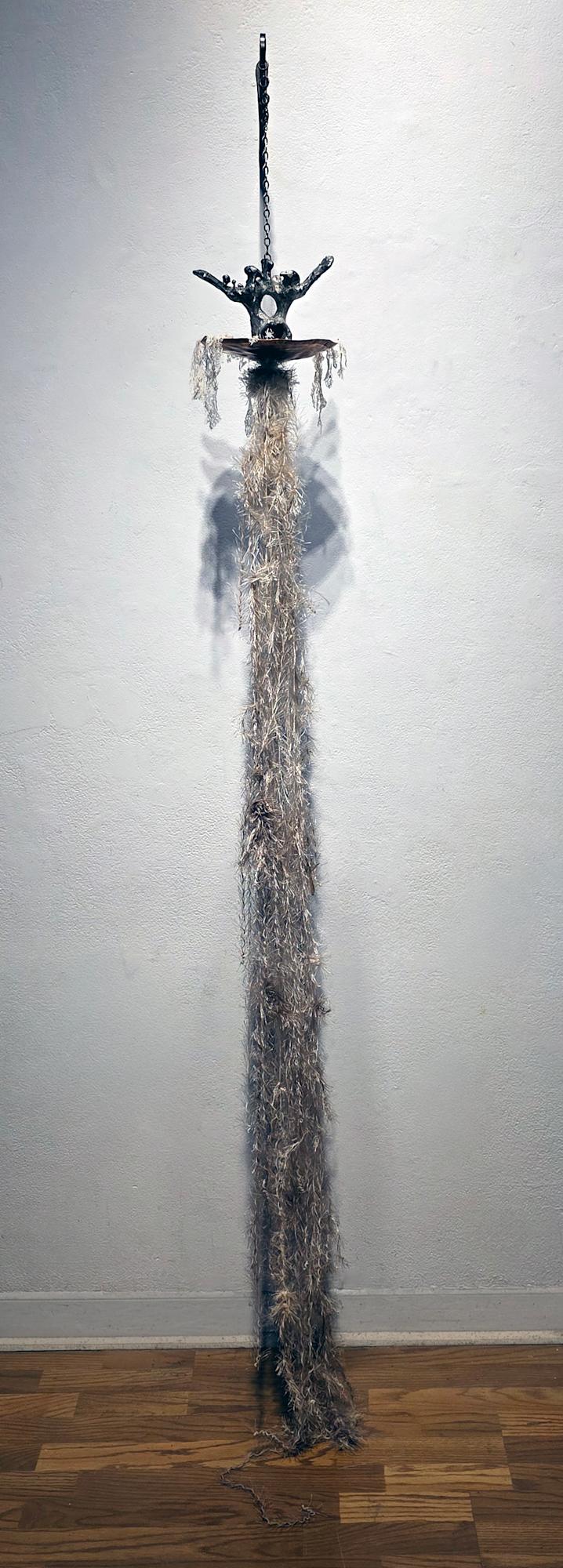 This memento mori sculpture is a meditation on life, death, and the unseen threads that connect all existence. At its core, a back vertebrae cast in aluminum serves as the structure of the piece—symbolizing the conduit of life’s energy, the spine that carries the electrical impulses animating the body. Delicate mushrooms emerge from its surface, a reminder of nature’s cycle of decay and renewal.