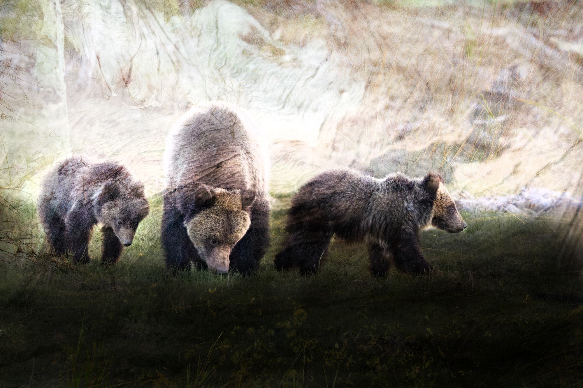 This image is an invocation of that legacy. A mother grizzly and her cubs move as one—separate yet bound. The mother does not wait. She leads.