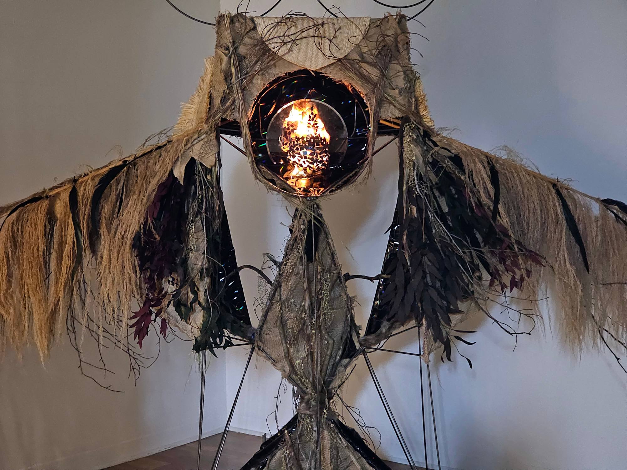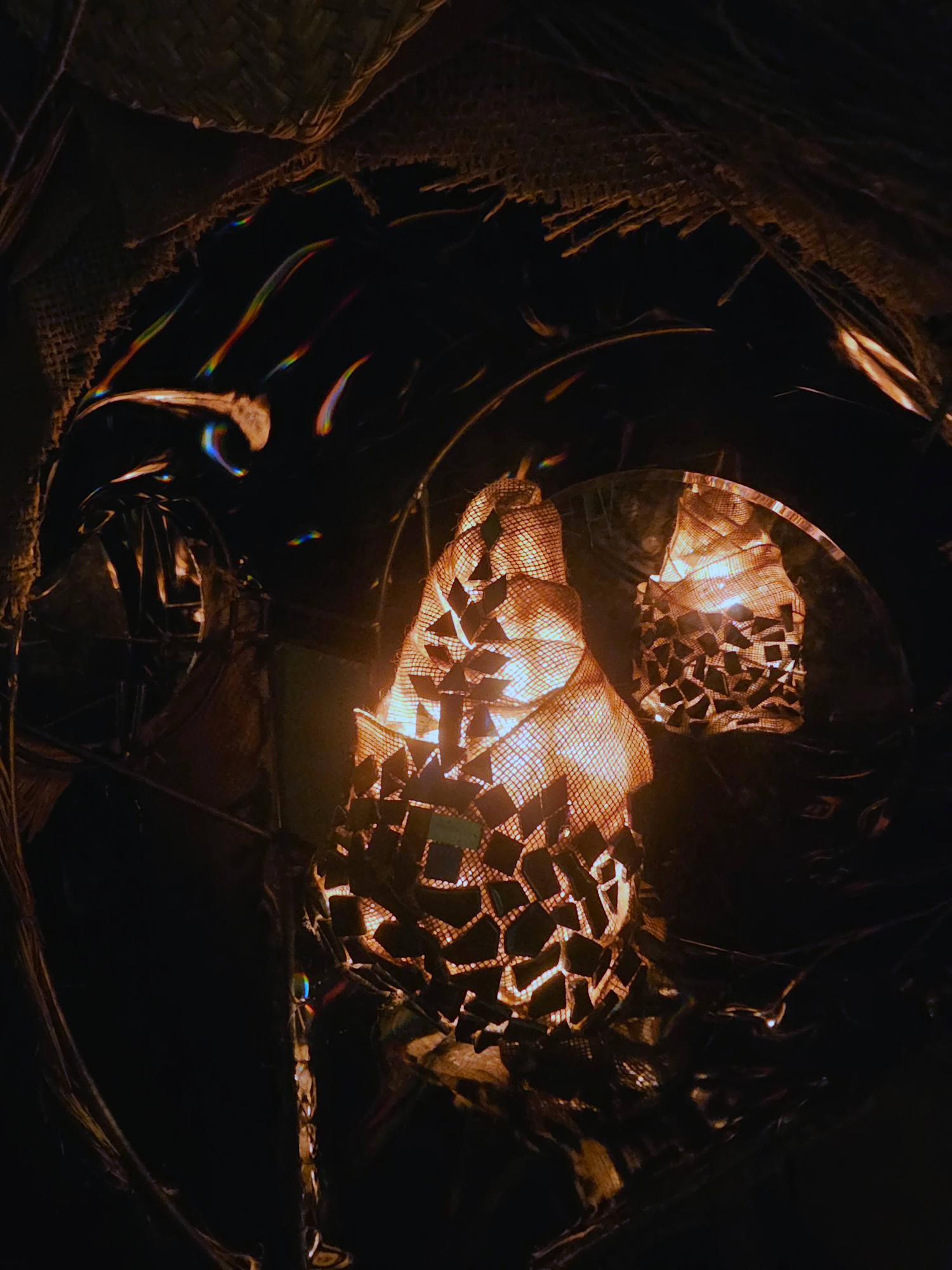 This piece is a totem to the celtic goddess, The Morrigan. She is a death goddess who deals with lookibng into the deepest, darkest places within yourself in order to do the hard shadow work and shine light on what lays hidden inside. Through this process, the ignored, rejected parts of ourselves are tranmuted, understood, and integrated into our being. Using imagery from her myths, I created a cave of mirrors at eye level to draw the viewer into the reflection of self. Centered within the cave is a form that serves as both the head of a crow and as a glowing heart, illuminating all the dark places within the cave of reflections.