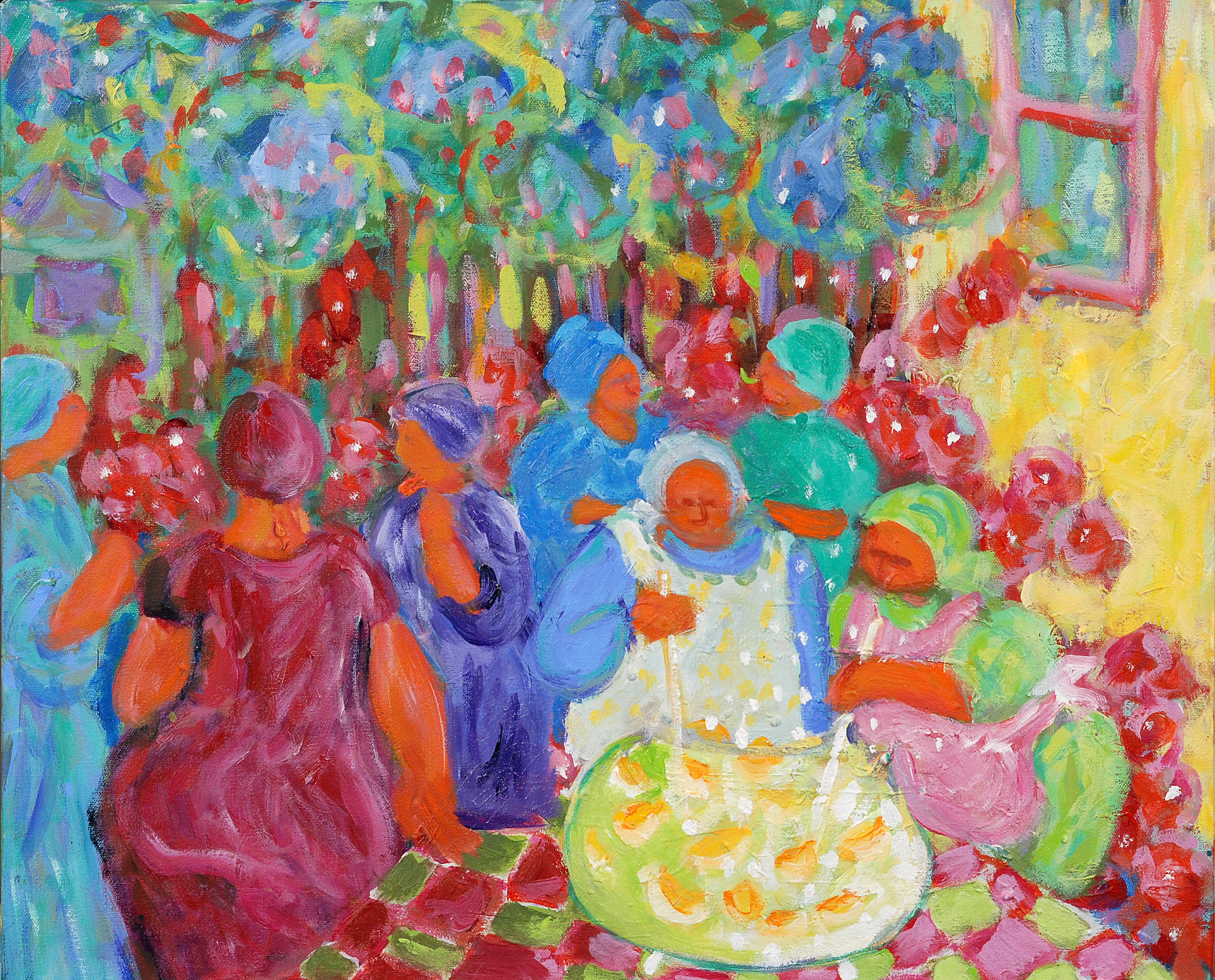 This painting from my mind, is a magical moment when a group of women gathered for a chat and lemonade and as their emotion and chatter grew, lo and behold, they ended up stirring up a batch of blackbirds, such is the power of communication.