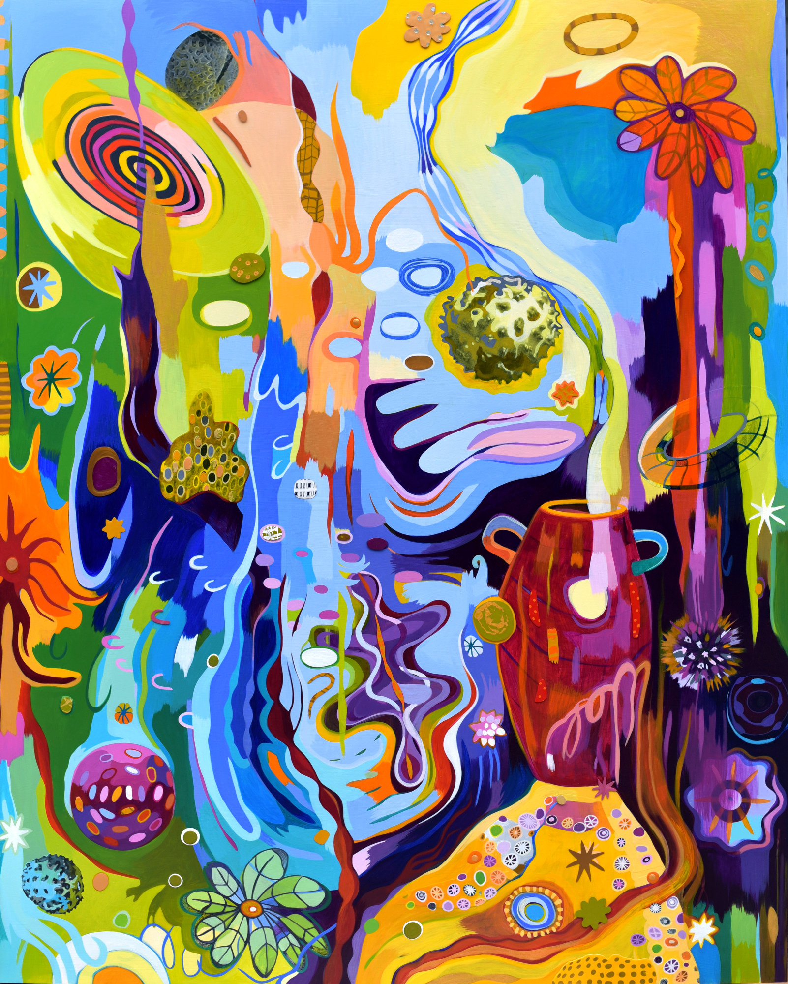 Fluid and evocative, this abstract painting is driven by memories of swimming in the ocean, a composite of sensations, re-imagined shapes and recollections of being fully immersed with the pulsing tide and sea-life. Sections of the painting have abstracted imagery of plant forms and dimensional paint shapes.