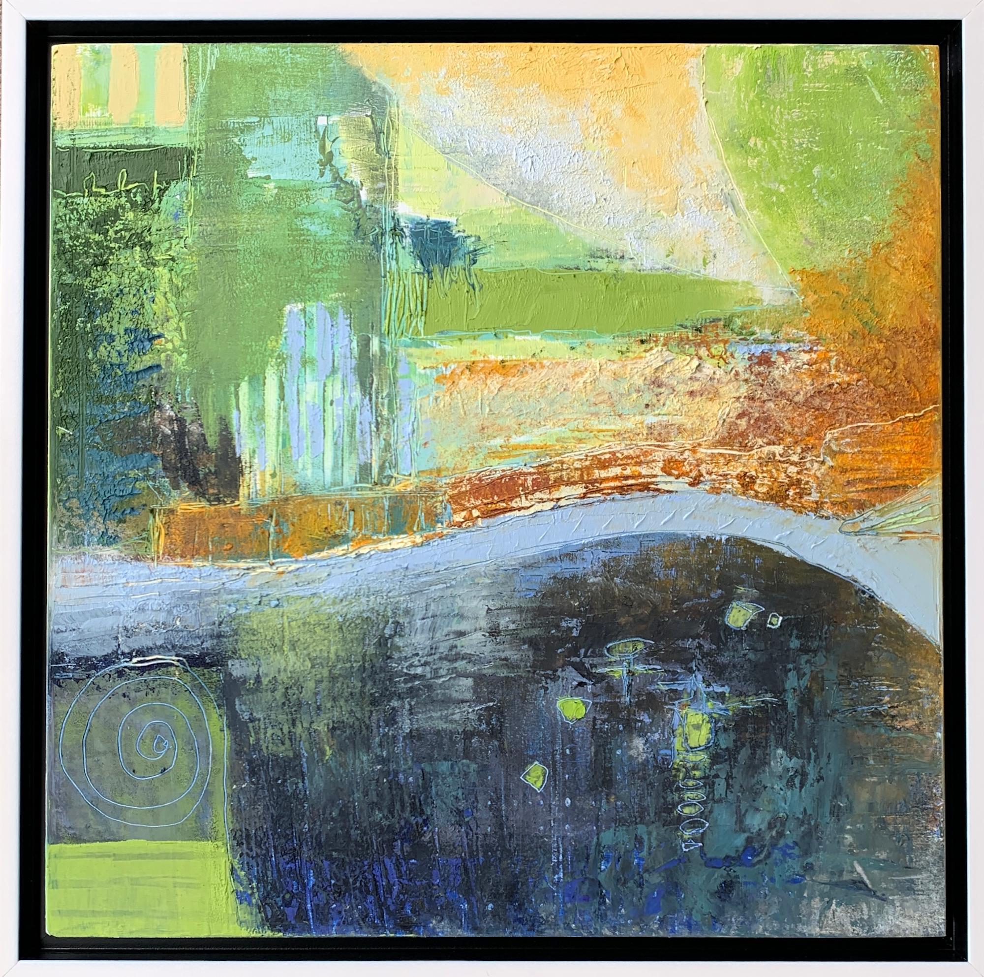 12 x 12 oil and cold wax abstract landscape on wood panel. Mounted into 13 1/2 x 13 1/2 x 1 1/4 white float frame.