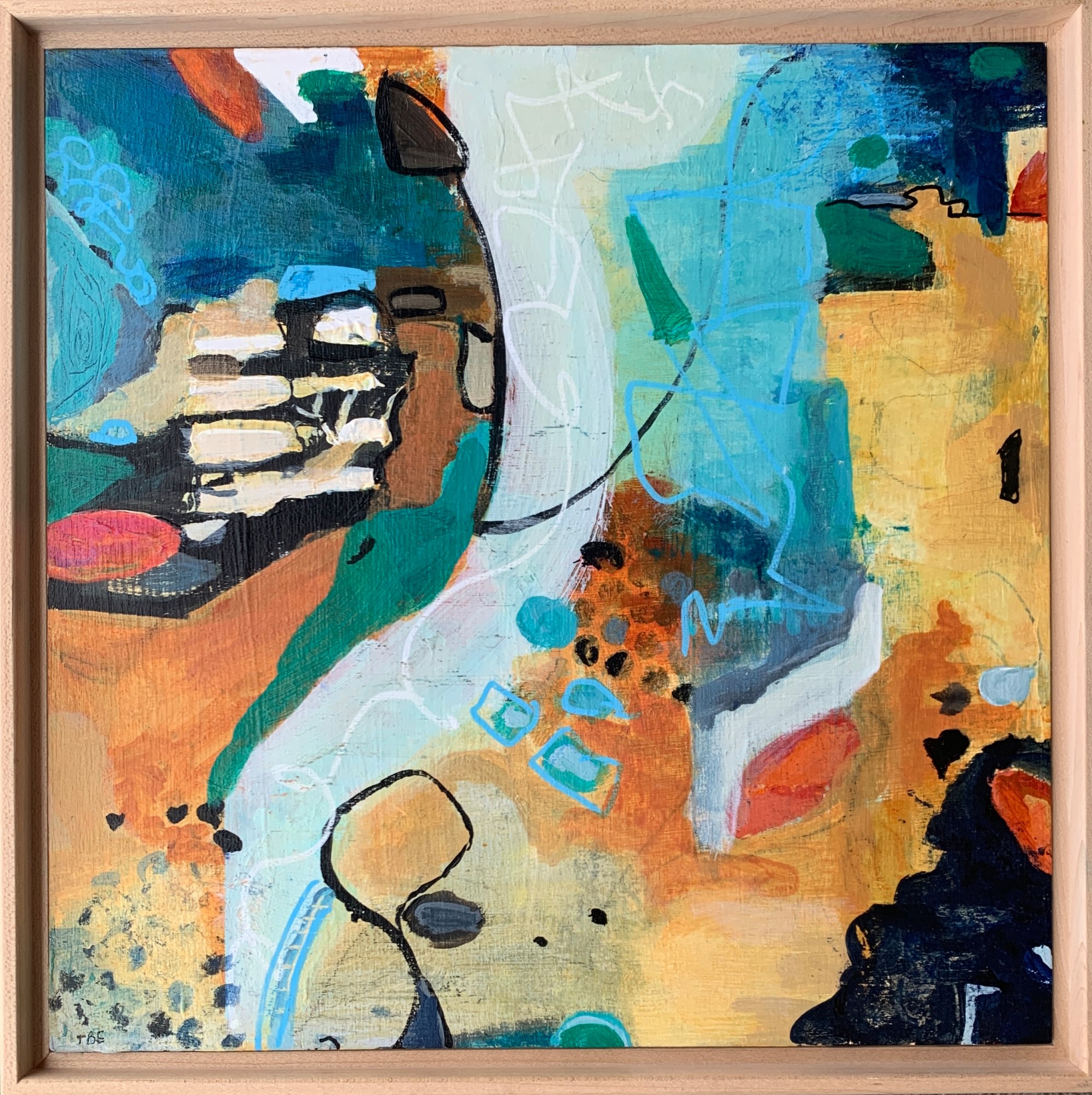 Abstract acrylic and mixed media painting on wood panel. Framed with natural wood floater frame. Part of "Hope and Resistance" Series.