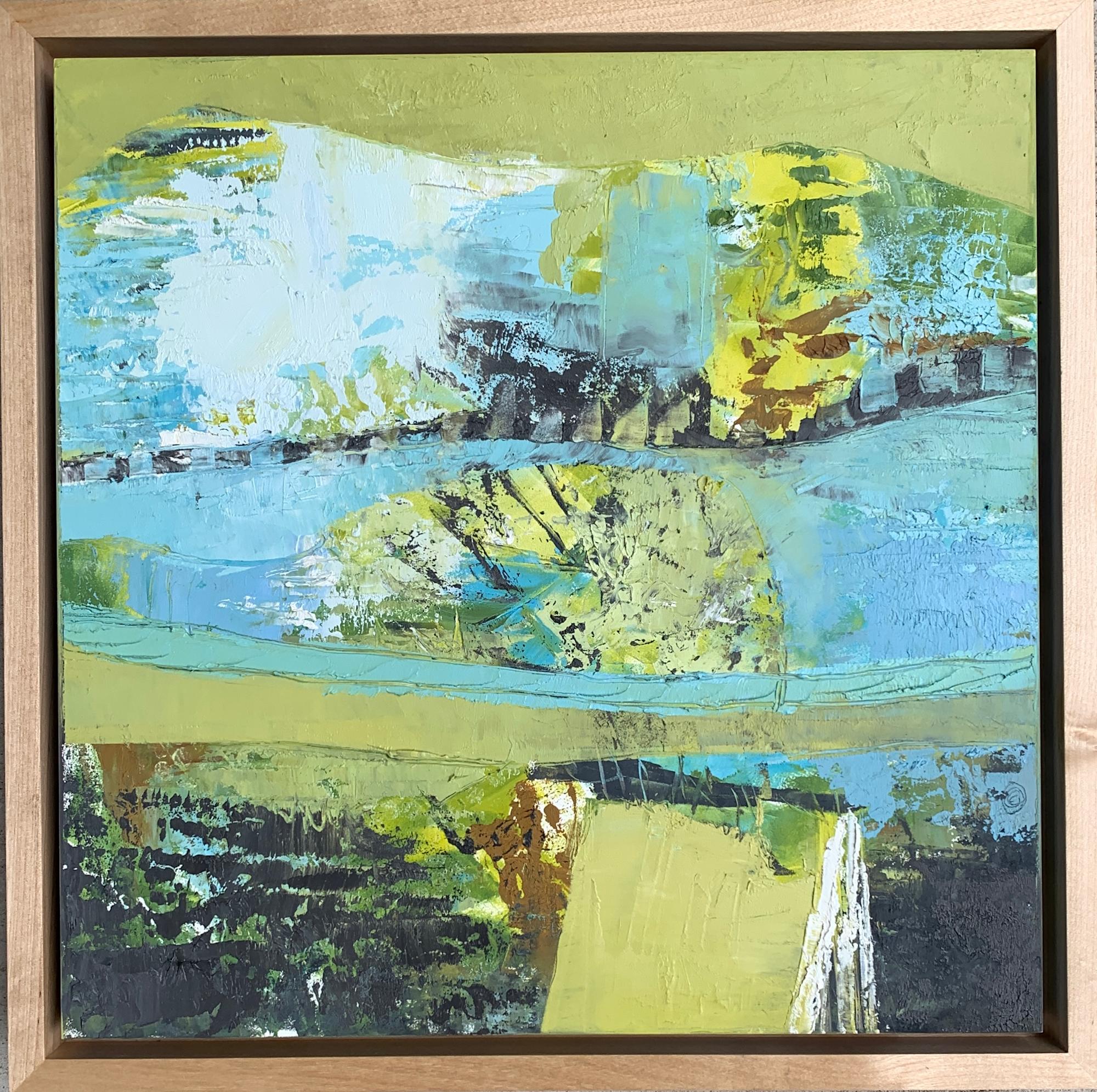 12 x 12 x 7/8 oil and cold wax abstract painting on cradled wood panel. Mounted into 13 3/8 x 13 3/8 x 1 7/8 Ampersand natural maple float frame with bold edge.