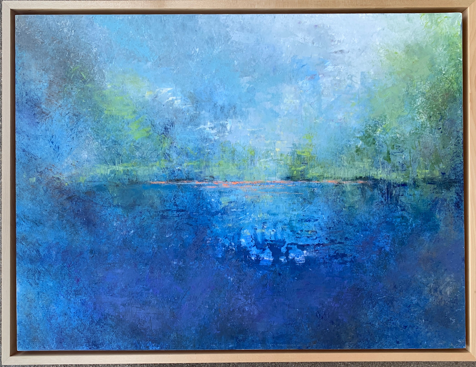 18 x 24 x 1 1/2 abstract painting on cradled wood panel. Mounted into natural maple float float frame.
