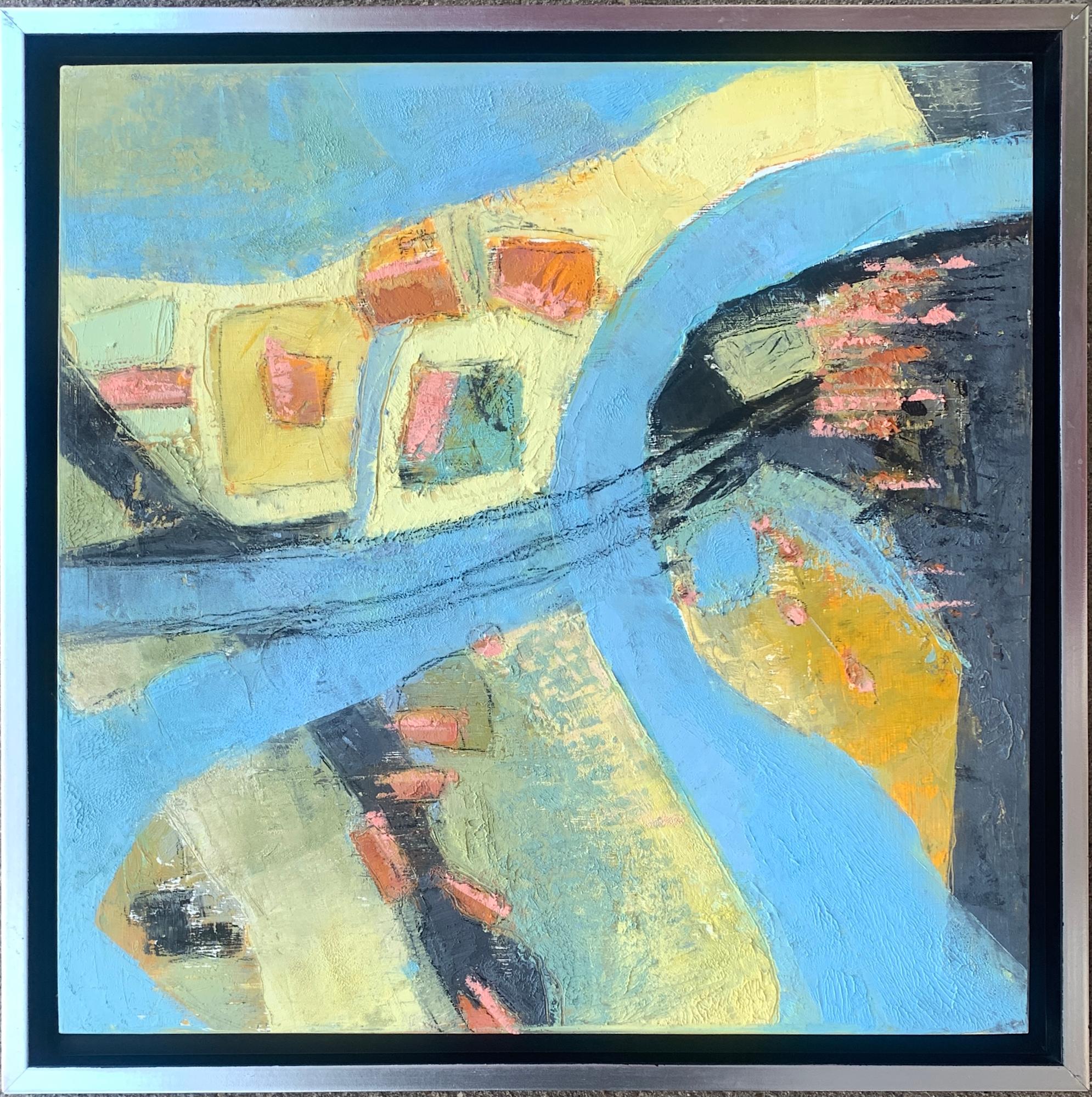 12 x 12 x 3/4 oil/ coldwax/ mixed medium abstract painting on cradled wood panel. Mounted into silver/black float frame.