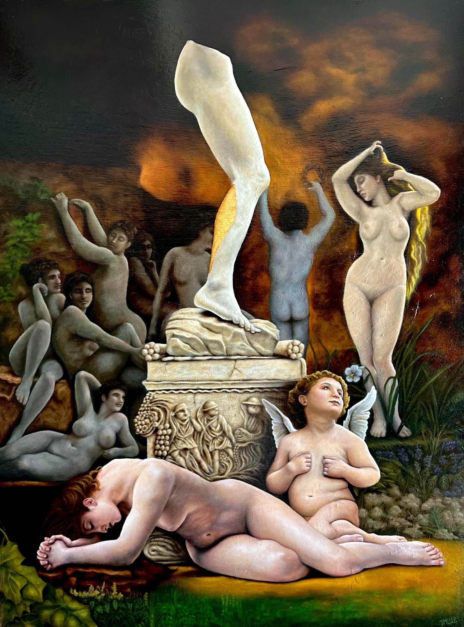 Started in the fall of 2020 during the pandemic as a study of the work of William A. Bouguereau, and completed in the spring of 2023. Its textured surface is due to it being painted over an older work that was never completed. The goal was to make something beautiful out of something that was not beautiful at all. While not denying what was underneath, the imperfections of the past come through as part of the present.