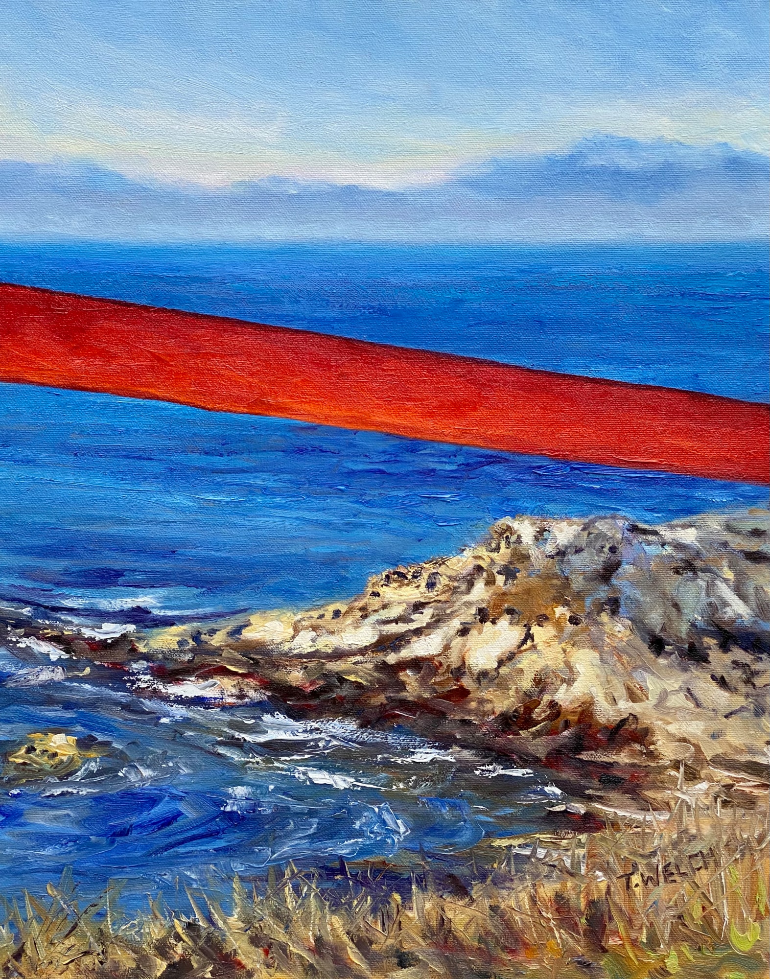 Artist notes: There is often an unbelievable blue to southwest coast of Canada. We know it as sunshine, warmth and energy. But it often surprises the viewer in a painting - that blue, could it be true? And then there is the red line danger of climate change that is visible to anyone who cares to look. Heat domes causing massive die off of shell fish. Atmospheric rivers causing severe flooding that fills the Mayne Island shores with uprooted and broken trees and silt. This addition to the Red Line Series is about the tension between our human activity and the beauty of nature.