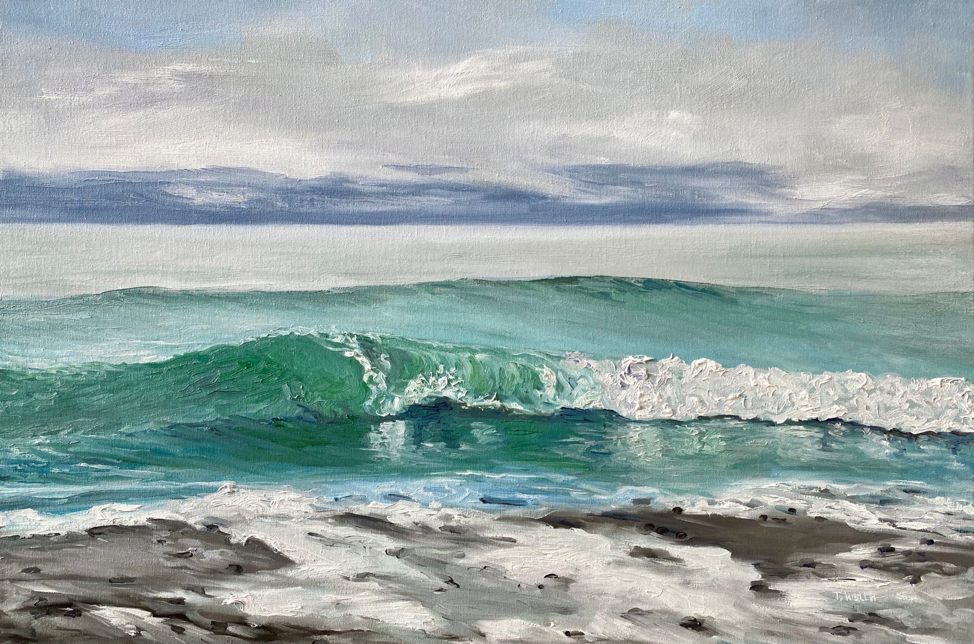 Artist notes: The backpack with plein air gear can still be felt resting on my shoulders as I step up to this larger canvas later in the studio. What a morning as the fog started to lift and the sea let go of its grey cloak.