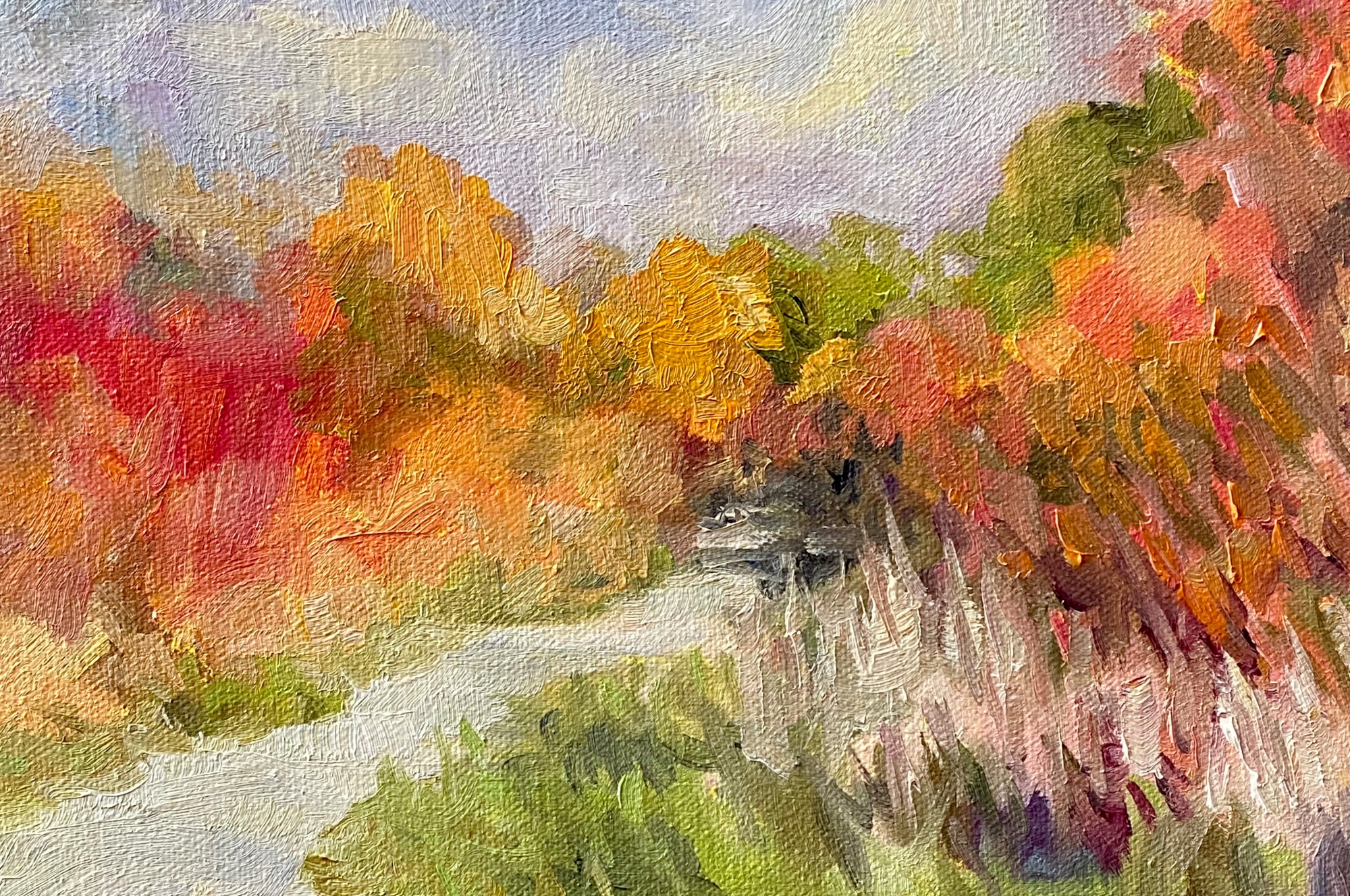 Artist notes: Just inside the urban areas where homes and farms intervene with forests, I was introduced to a piece of the Cowichan Valley Trail that has magnificent, almost sentimental, views. On this specific morning the clouds were forming at ground level from fog. The moment is brief and fleeting … until it was rendered on my canvas for viewing over the next few hundred years.