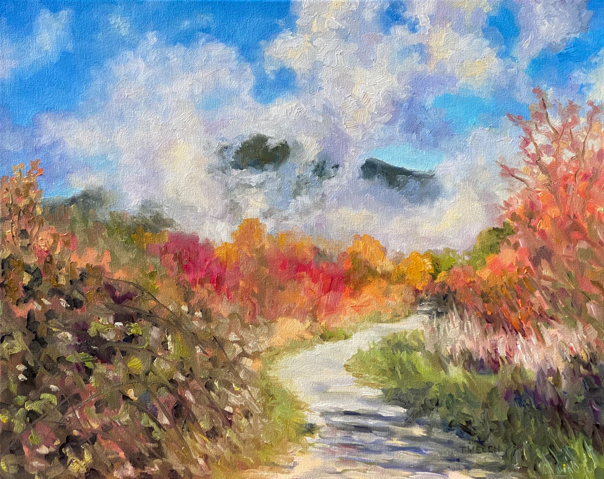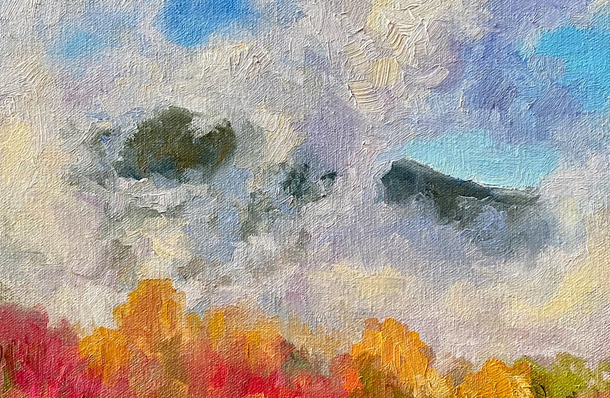 Artist notes: Just inside the urban areas where homes and farms intervene with forests, I was introduced to a piece of the Cowichan Valley Trail that has magnificent, almost sentimental, views. On this specific morning the clouds were forming at ground level from fog. The moment is brief and fleeting … until it was rendered on my canvas for viewing over the next few hundred years.
