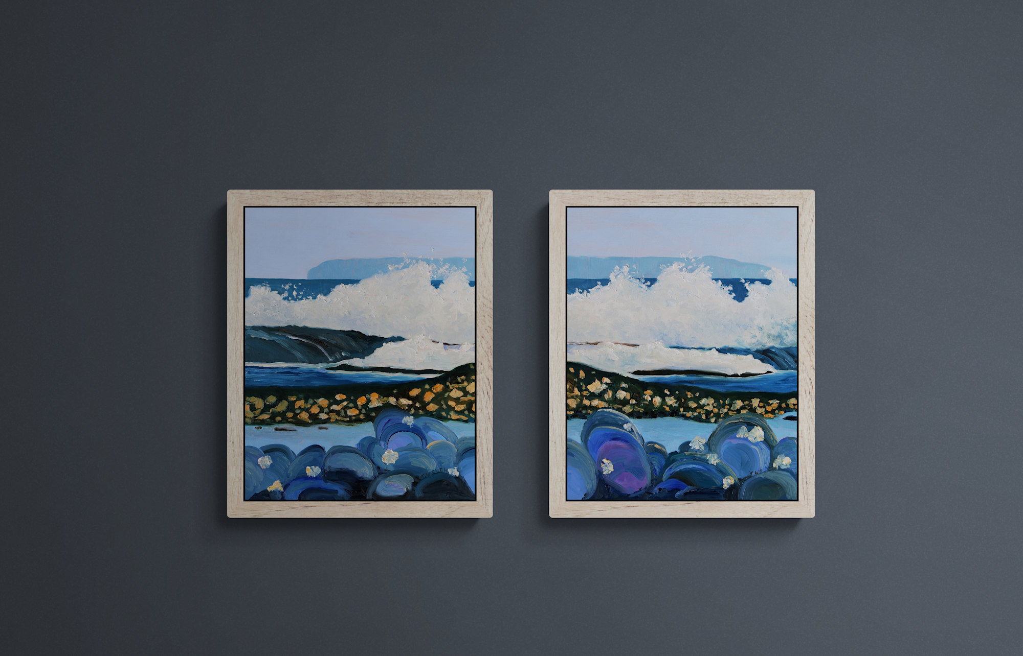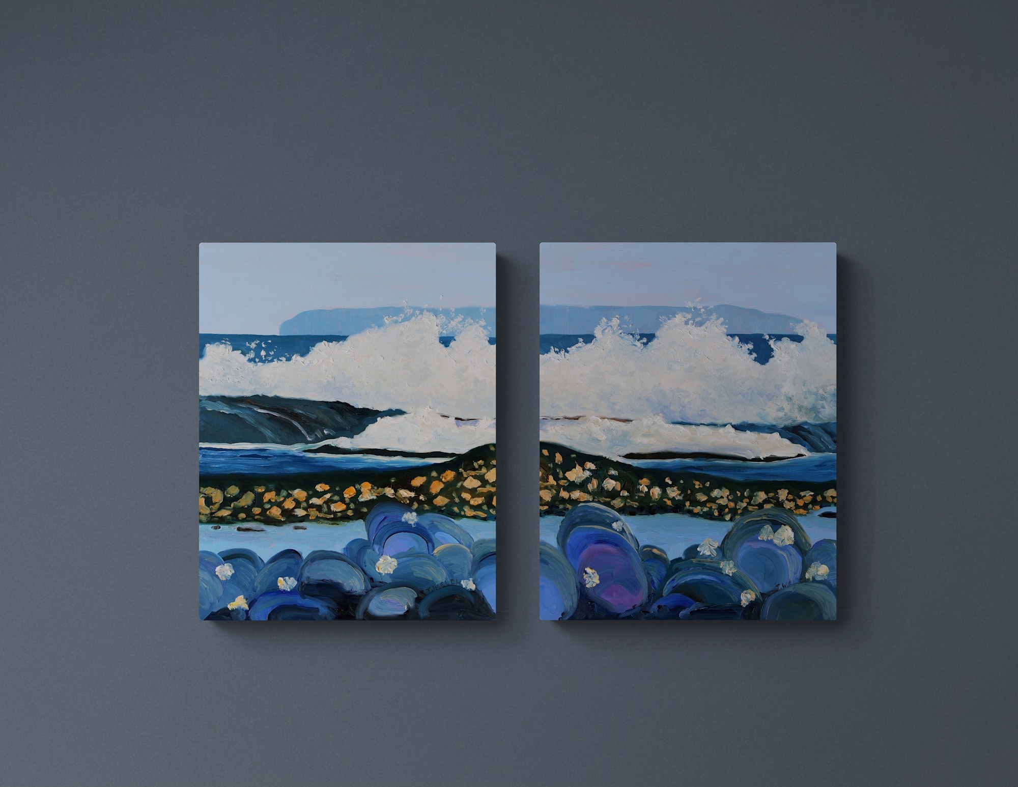 Artist notes: A northwest wind picked up the sea and tossed it over the sandstone reefs in the bright September Sun. I gathered up a spray of ideas and returned to the studio. Blowing troubles into washes of seaweed covered oyster shells while curving over mussels and then settling into the tidal pools of possibilities. Figurative yes. Abstract in shapes and an imagined composition. Time and place resonate deeply within and between the surfaces. This painting also has a companion painting. I decided on a diptych to capture the entangled layers of dramatic textured shapes and colours.