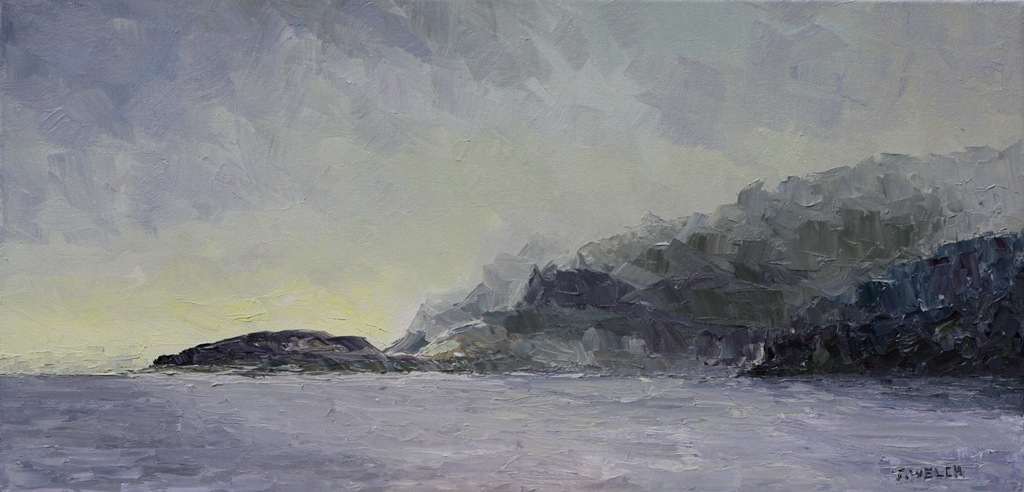 Winter fog in the southern gulf islands is often dense and close to the sea. Islands appear and disappear as the ferries take passengers through the inside passage. The mysterious landscape has a beauty that is hard to know unless one lives with it for the long winter months of off-season quiet. This 12 x 24 inch oil on canvas is my rendering of this tactile west coast Canadian landscape experience.