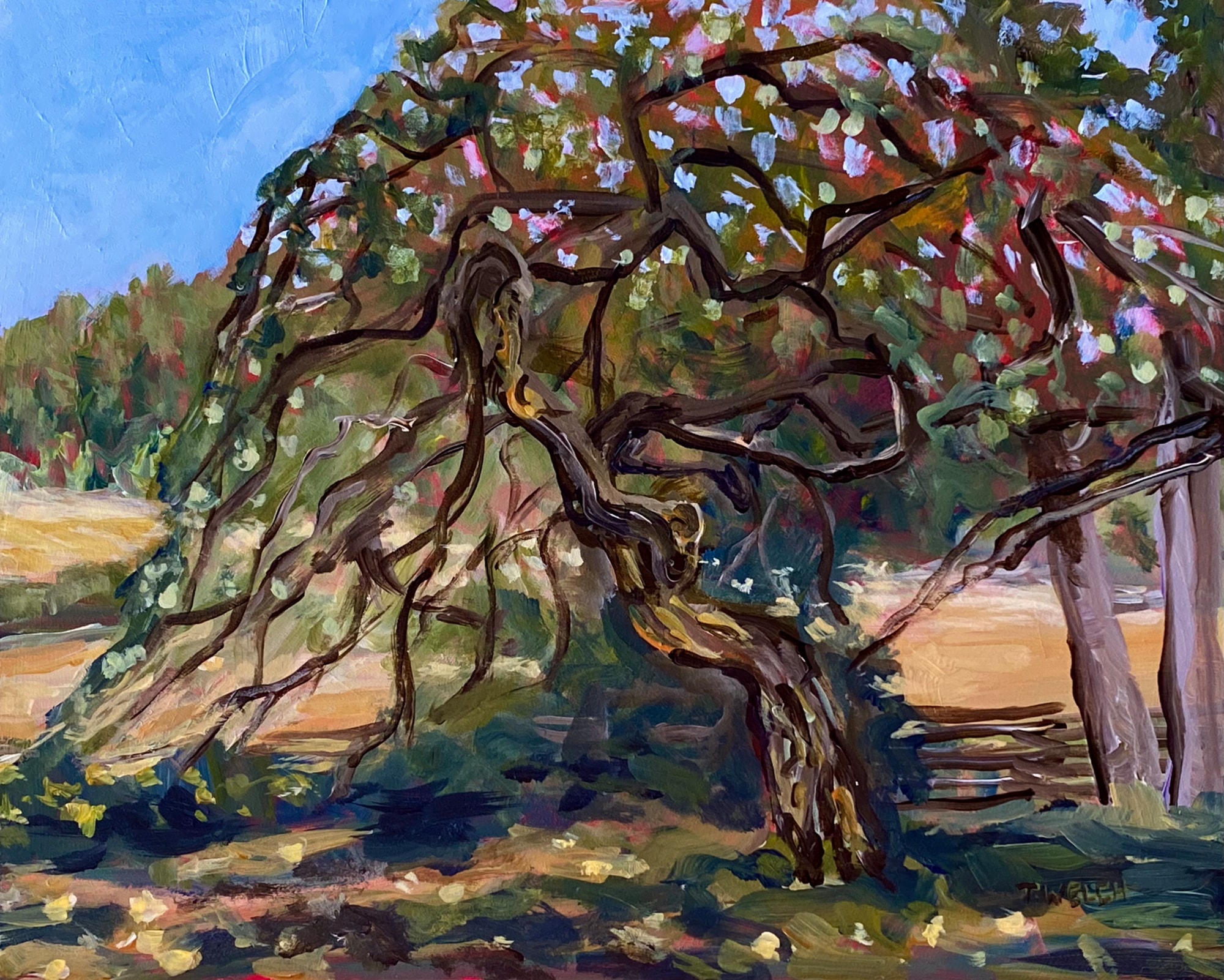 Artist notes: I have been to the farm many times and know that this is the tree with the sweetest golden plums. It is old enough to have witnessed many family and friends gatherings and it is the counter point it a large arbutus tree which is much grander in stature. Still, what painter can resist those curves?