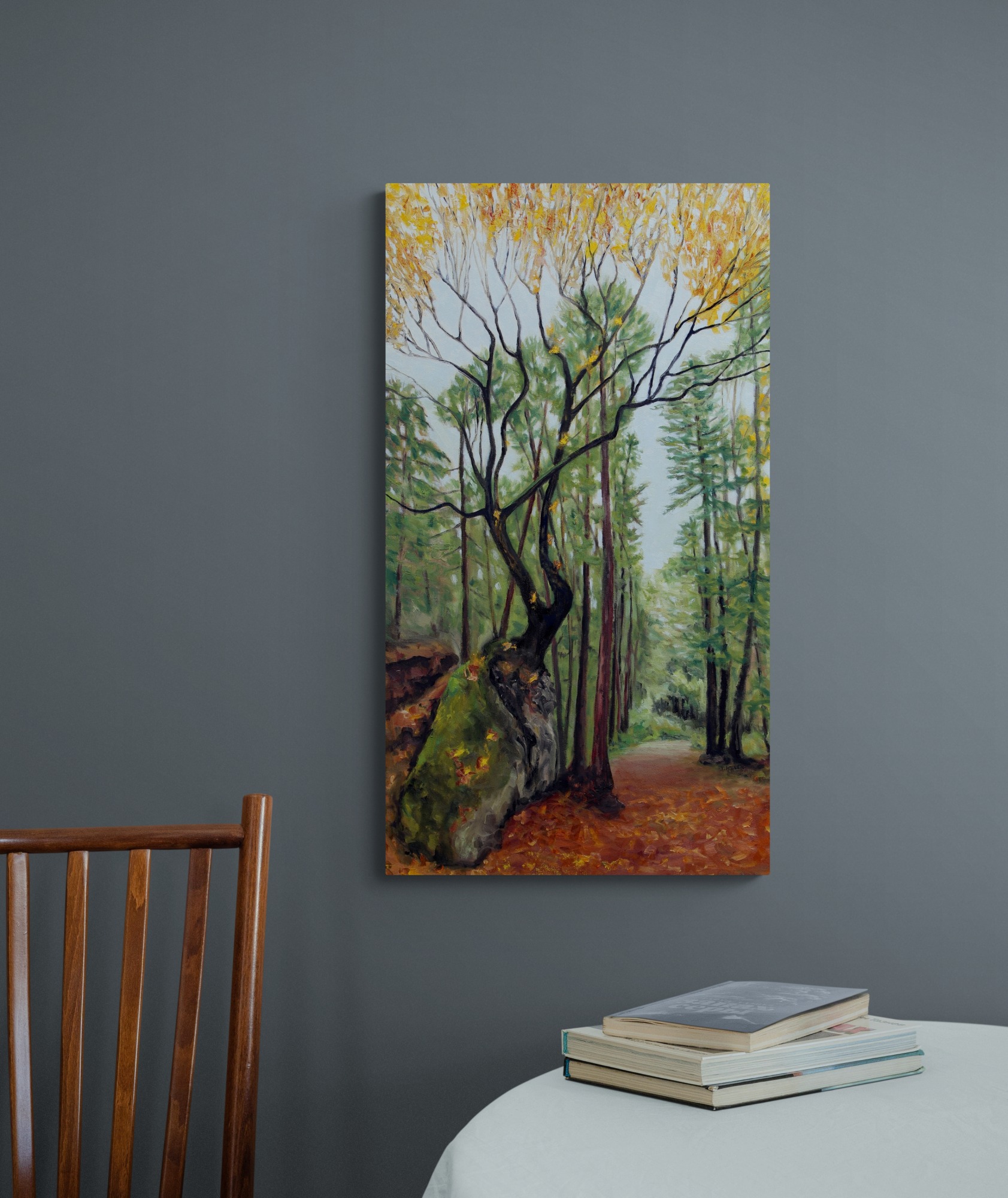 Artist notes: I was raised by trees, not because I didn’t have loving parents but because I spent so much time alone in the company of trees. Trees are great company. This particular Maple tree is excellent council on the strength of persistence and creativity. She is a gentle woman tree who guards the trail and brushes me with her falling leaves as she lets go of the southwest coast autumn sky. She has grown by spiralling around in mystifying swirls that allow her to perch on top of a large fallen conglomerate boulder while rooting down into the earth and holding herself and the boulder both in place. I cannot but wonder - how does she do it? A strong lesson for discovering how to grow where you are and “Thriving in Place”.