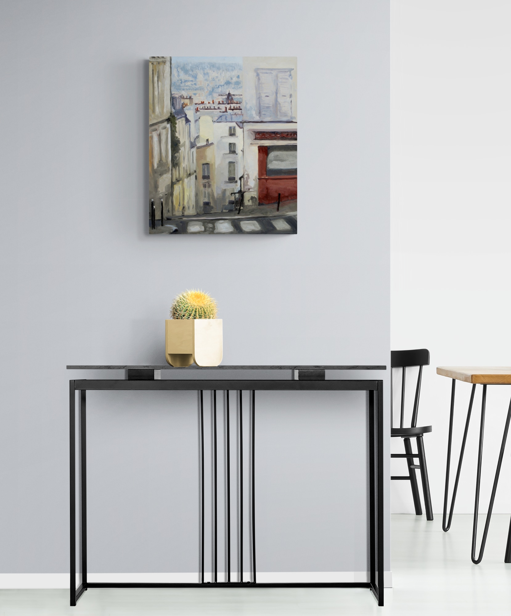 Artist notes: I have been up to The Basilica of Sacré Coeur for sunrise. It is mid June so sunrise is early. On my way back I stop just before I get to the top of Rue Drevet Stairs and crunch real low to get my reference image. As soon as I framed the view, I knew I was going to paint it. That was June 15, 2014. I have now painted it and it is June 14, 2023. Nine years later and I can still feel the pleasure of these champagne buildings catching the soft morning light.