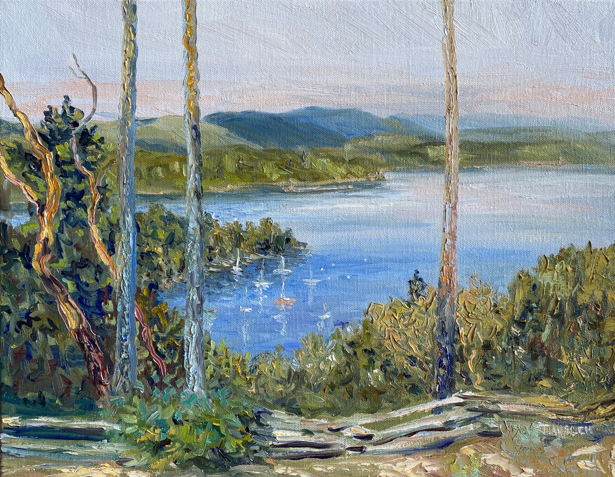 The early warm summer morning light sings a song to my brushes and they dance lightly across the canvas, as if suspended from the sky. Then the heavy earth tones drum a steady rhythm echoing across the view above Village Bay on Mayne Island in British Columbia. Together it is the music of my heart song.