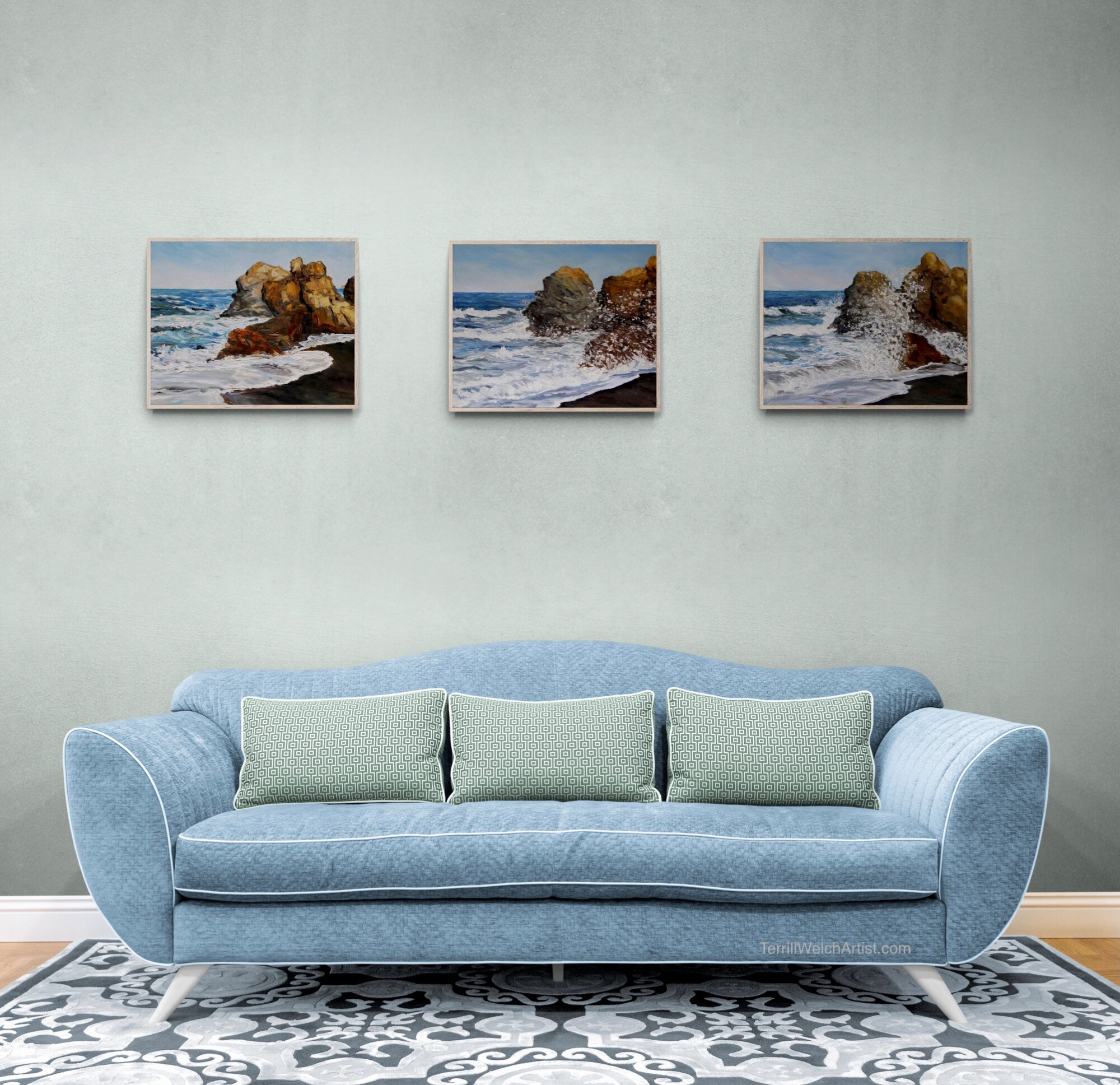 A vibration followed by the hard pressure of full impact. We know that the sea will wear at the stone repeatedly until it gives but in this moment of connecting we are fooled. The second of three related northern California surf paintings.