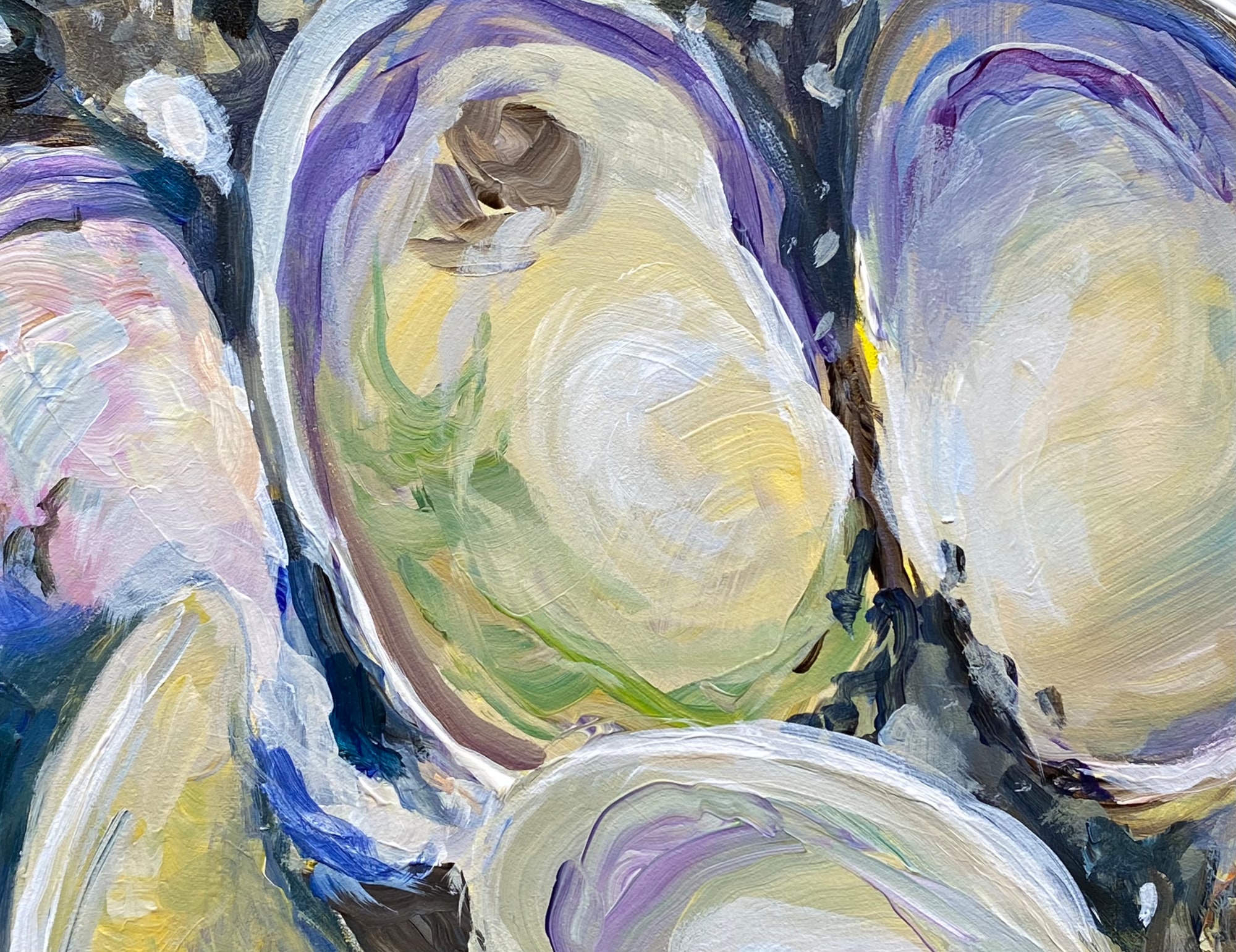 Artist notes: Crouching down next to a shell bed between the reefs, there are rhythms from the sea that organize abstract shapes. In partnership, my eyes and brain masterfully distills these shapes into mussels and clam shells. Later at the easel, my brush is loaded with paint and dances across the surface to keep them in place - just a little longer, touching and resting, as they wait for the tide to come in.