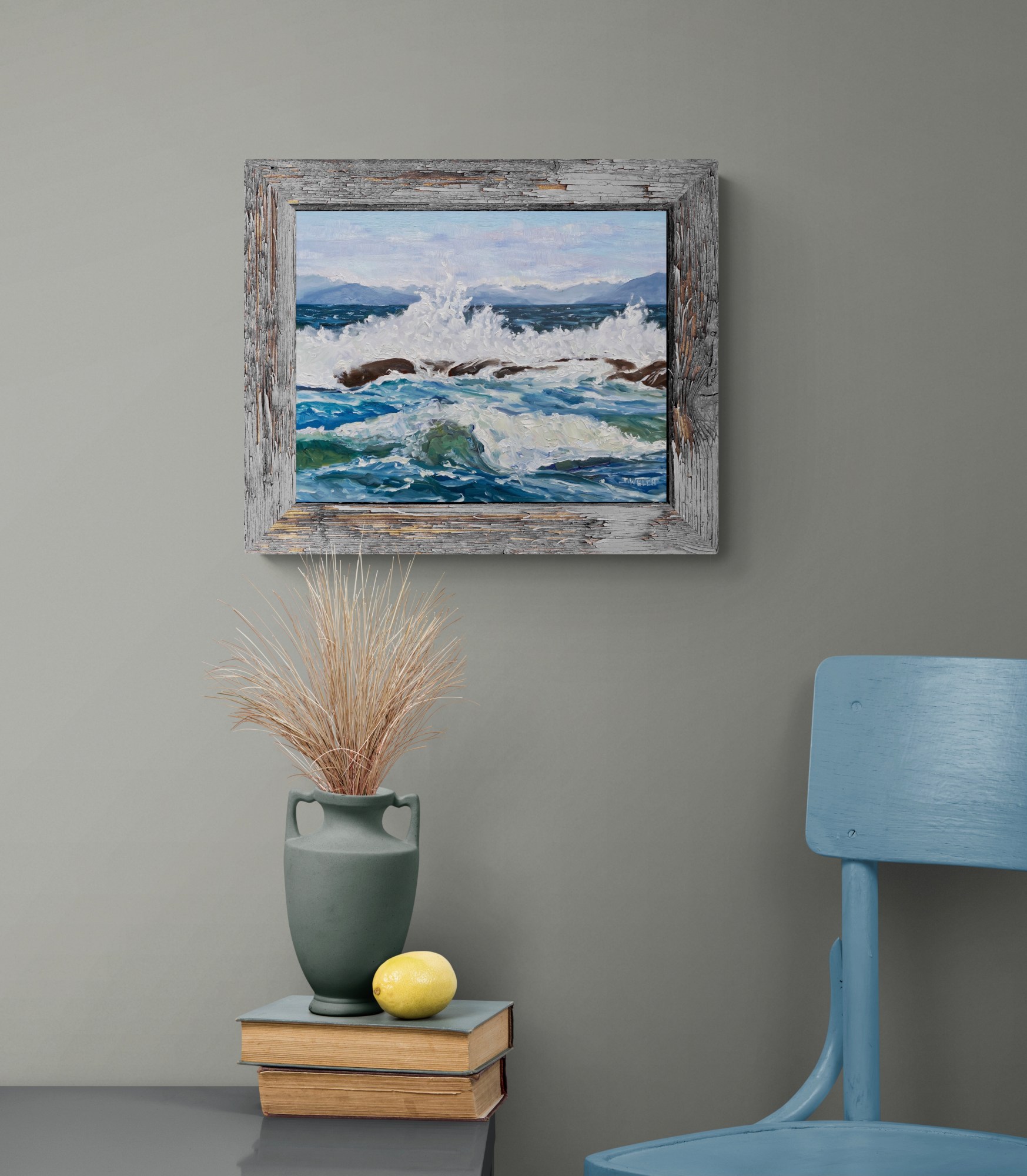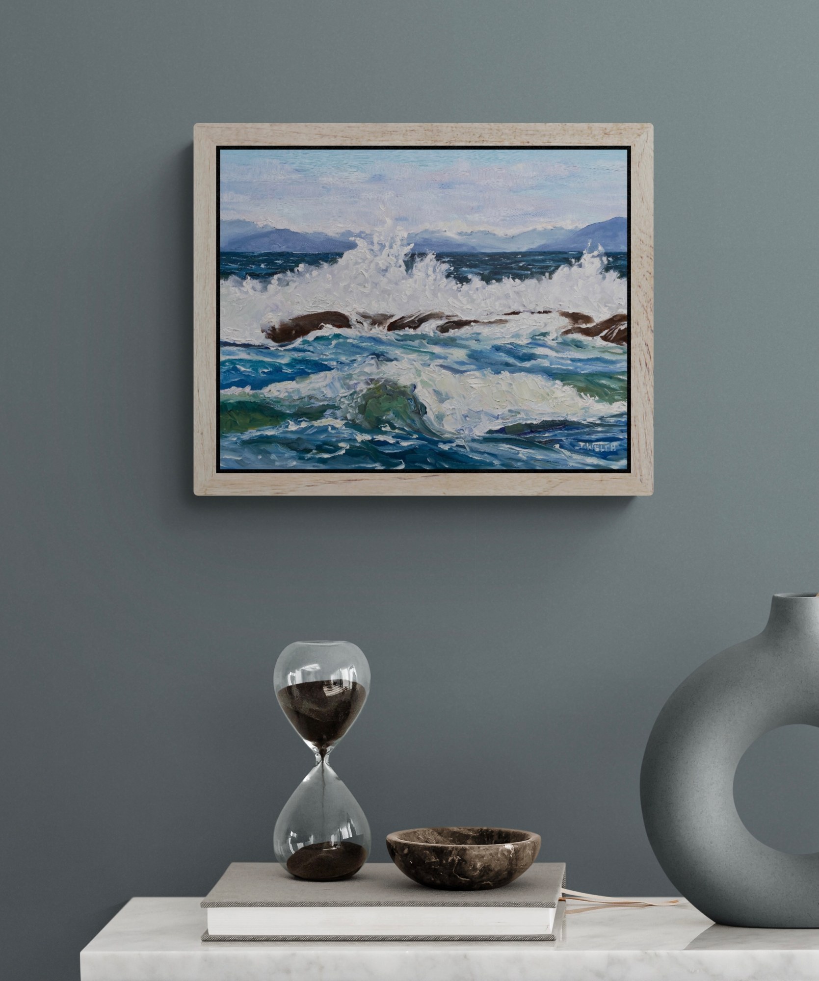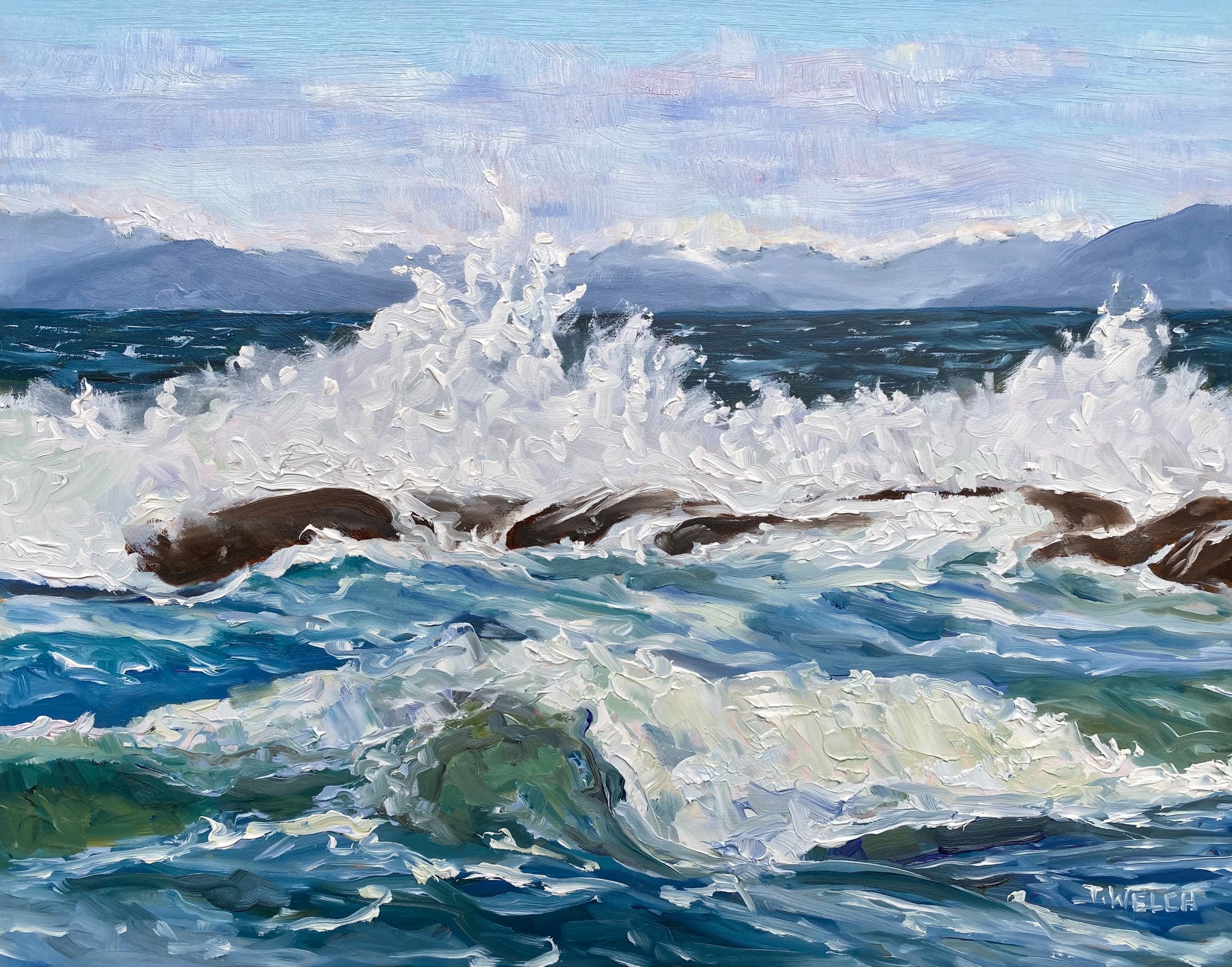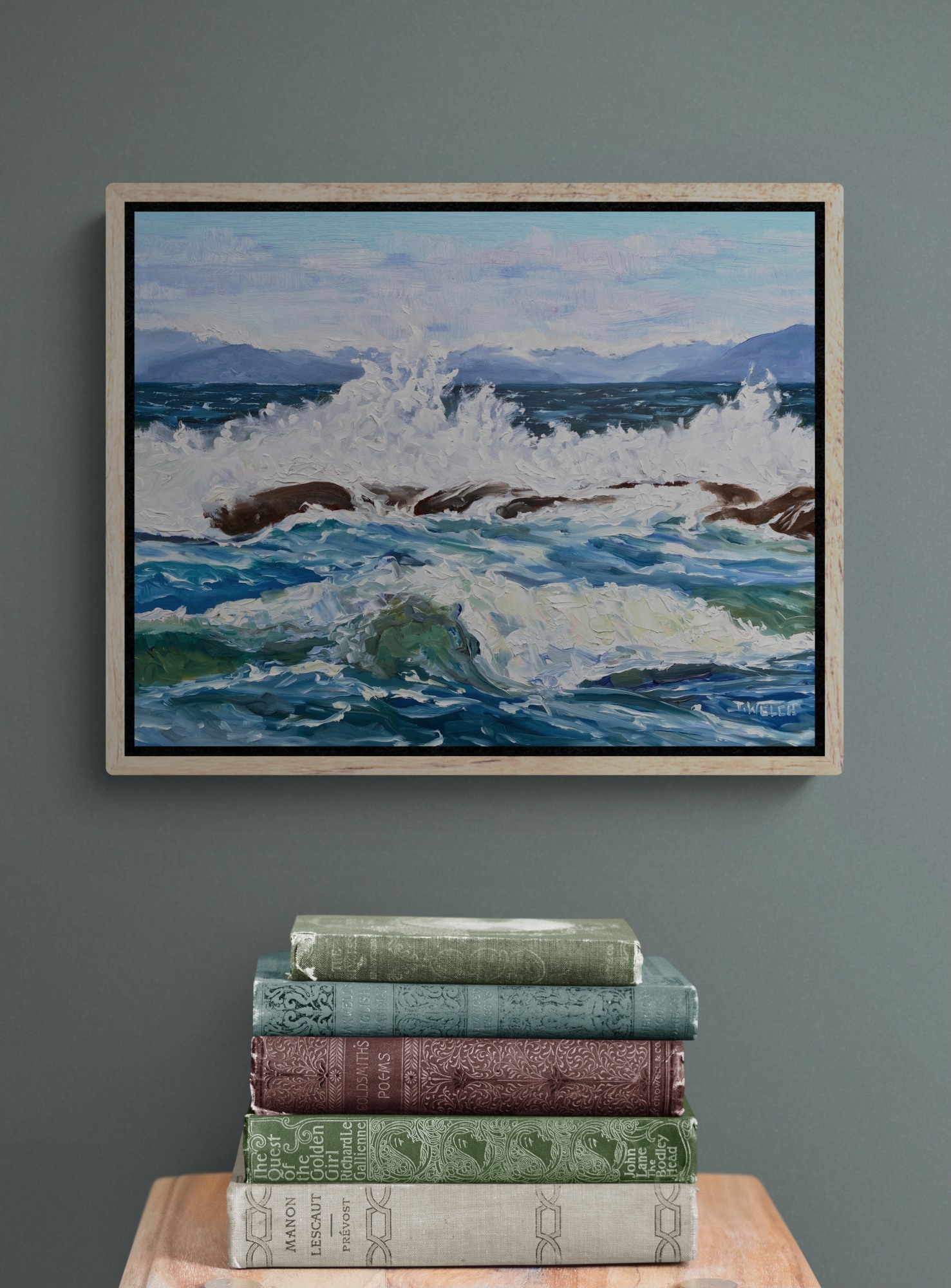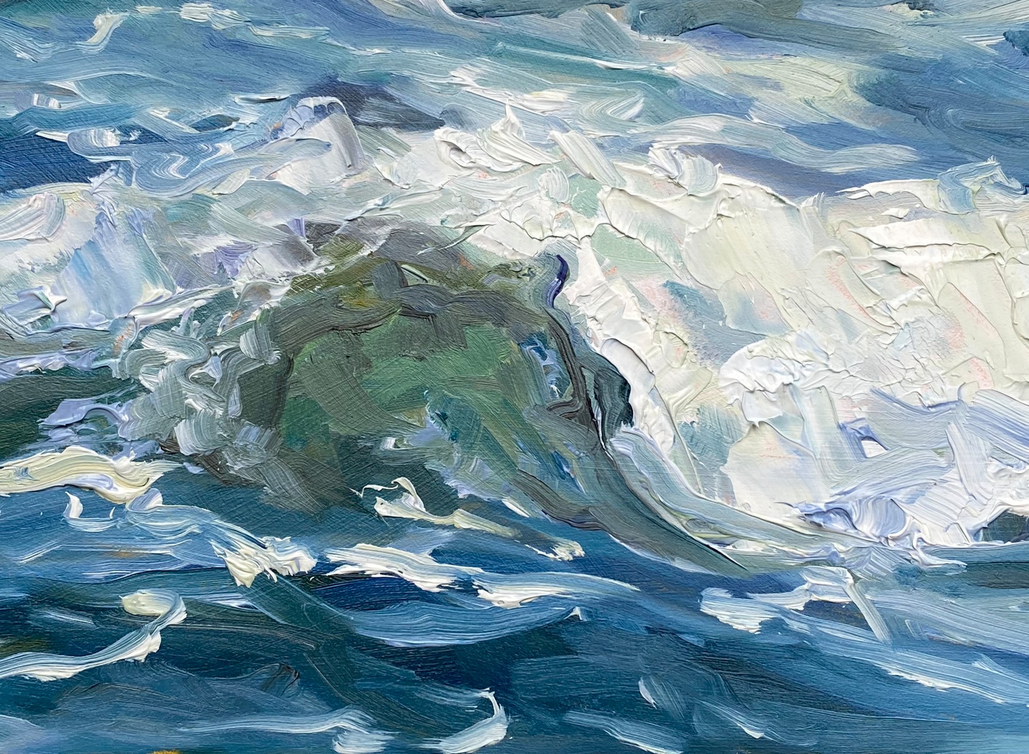 Artist Notes: An icy northwest wind whips up the Salish Sea in the Strait of Georgia with such playful laughter that I forget that I didn’t put my wool sweater on under my rain jacket. Such abandoned glee can do that. No one brush mark is too precious or self identified or defined. They are all in motion at once creating a vibrant whole as if the universe just lightly rested for a moment in paint