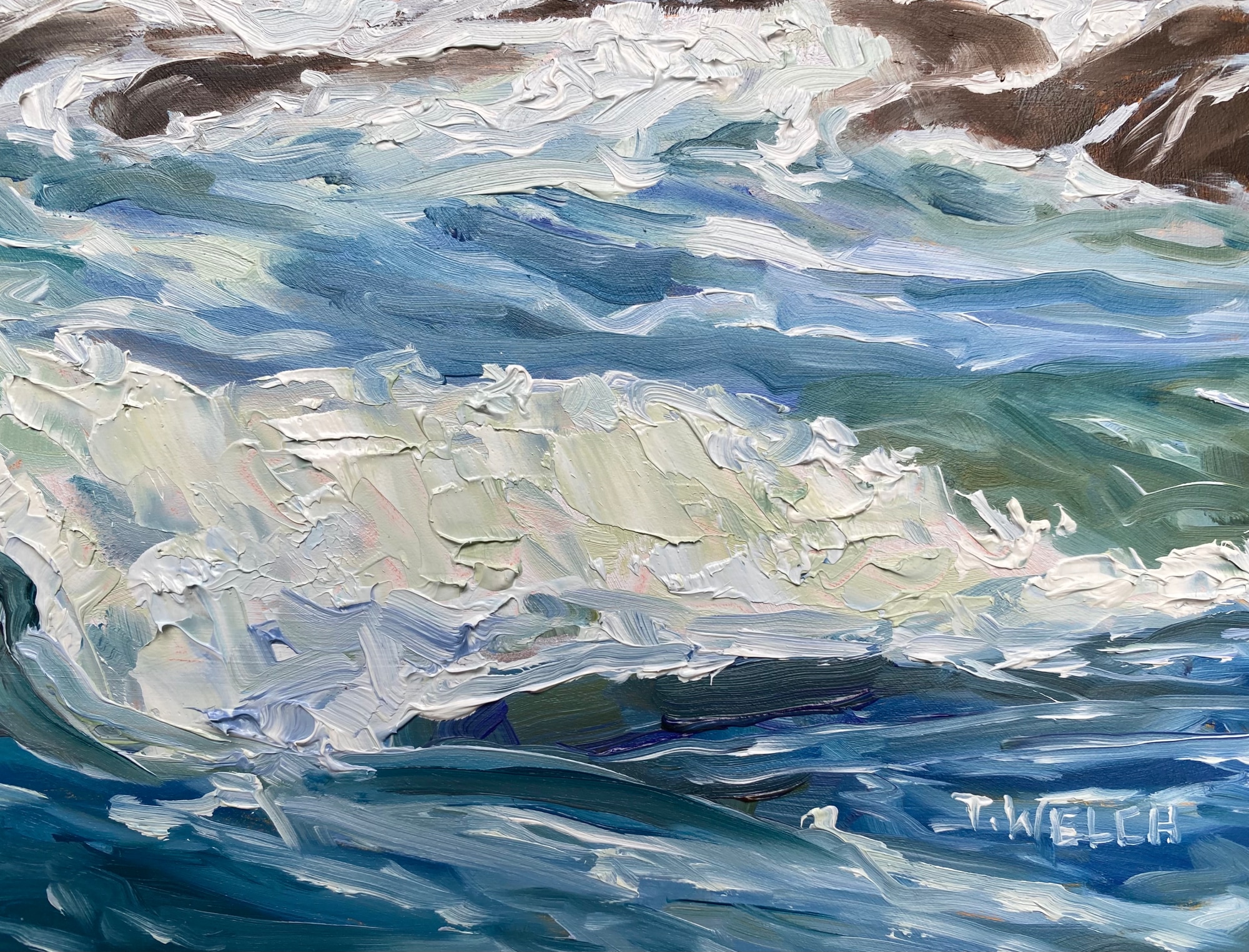 Artist Notes: An icy northwest wind whips up the Salish Sea in the Strait of Georgia with such playful laughter that I forget that I didn’t put my wool sweater on under my rain jacket. Such abandoned glee can do that. No one brush mark is too precious or self identified or defined. They are all in motion at once creating a vibrant whole as if the universe just lightly rested for a moment in paint