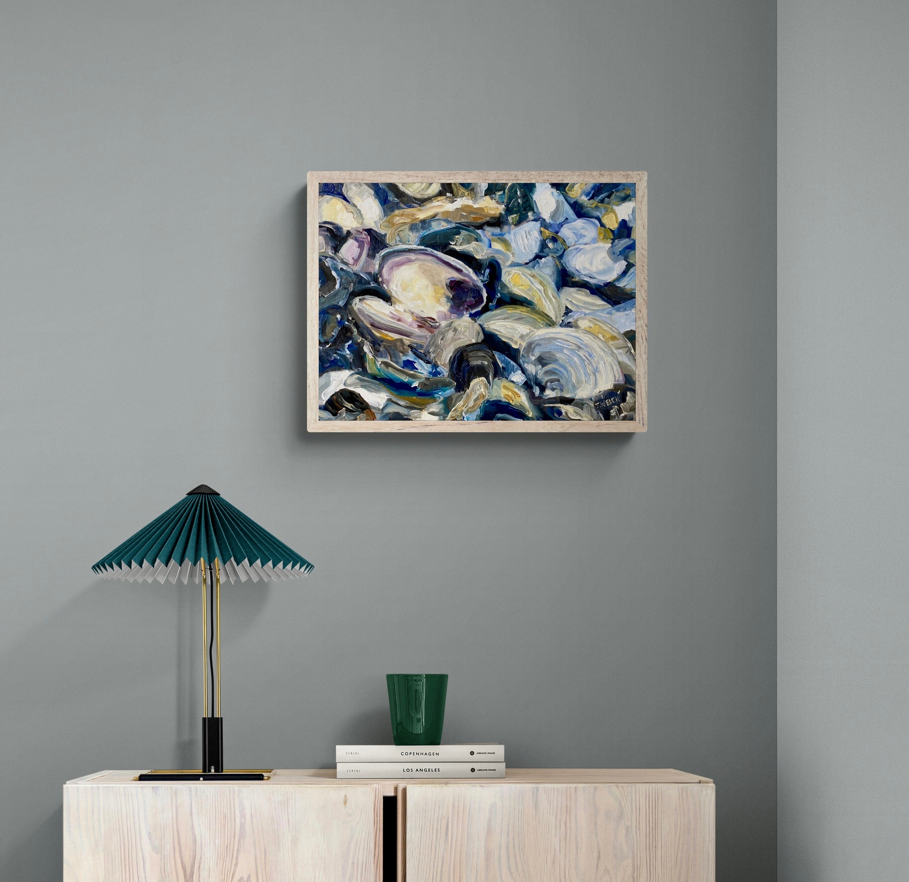 Artist notes: Shapes of shells drift in and out of random patterns, shifting colours move with the morning sun as I walk the reef. My brushstrokes are meant to capture more than seeing alone could ever offer.