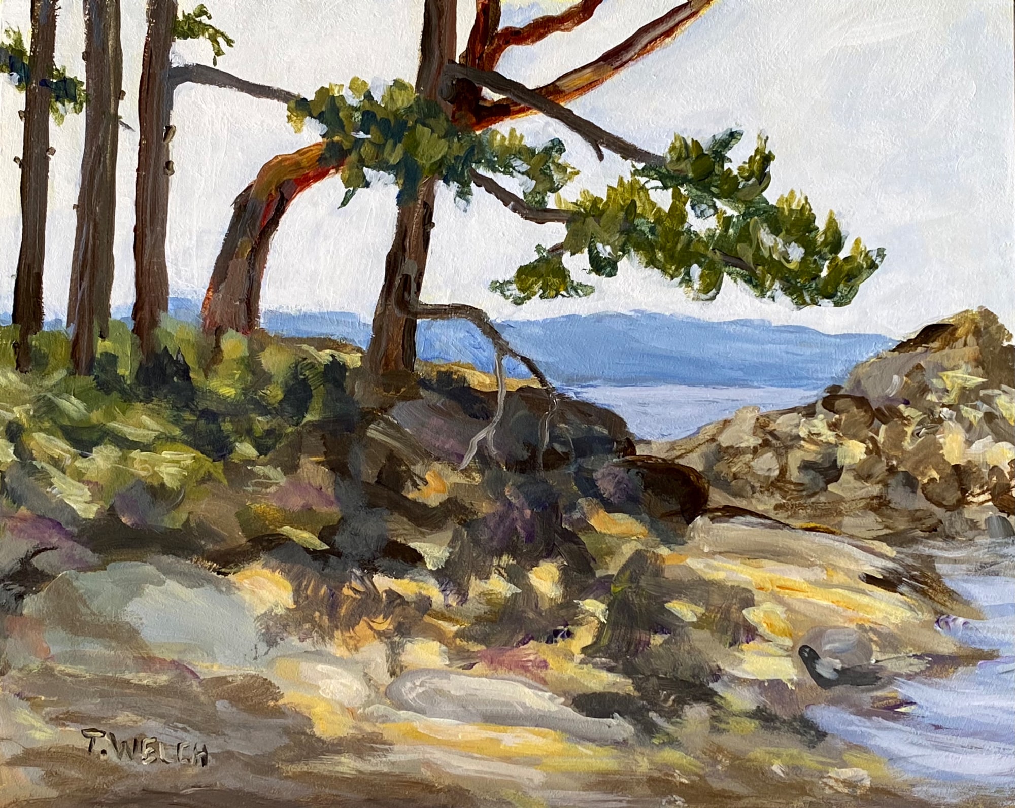 Artist Notes: It is midday at the end of June. There is a breeze in Oyster Bay on Mayne Island and quickly changing filtered light that make for ideal plein air painting conditions. I take it! Knowing where the sun will be in an hour and that the tide is on its way in helps to brush this fresh view lightly into place.